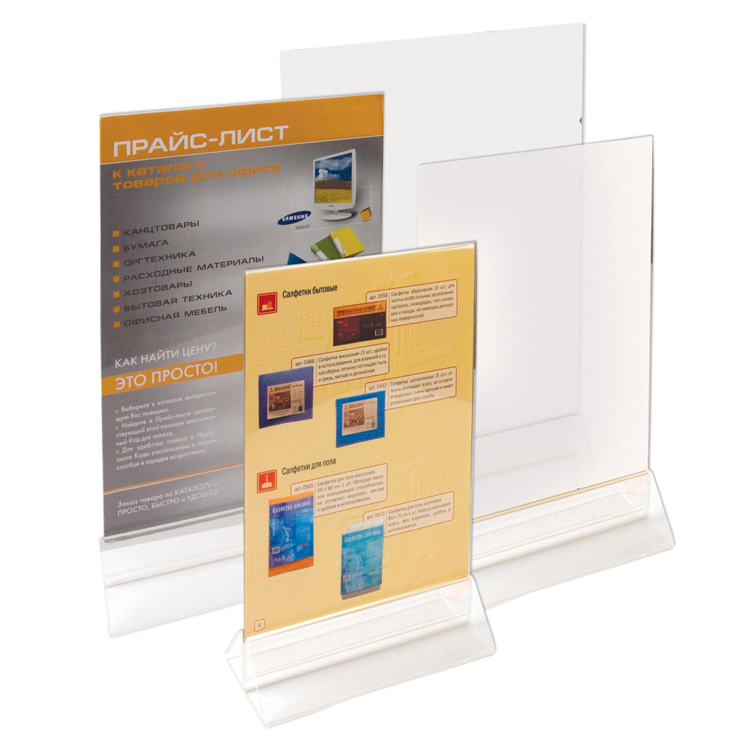 Вертикальная двухсторонняя настольная информационная подставка Attache изготовлена из прозрачного акрила, имеет устойчивое основание. Позволяет размещать постеры и другие демонстрационные материалы формата А4. Поставляется в индивидуальной защитной пленке, по 8 штук в упаковке. Подставка основа — съемная. Размеры изделия (ВxШxГ): 297×210×75 мм.