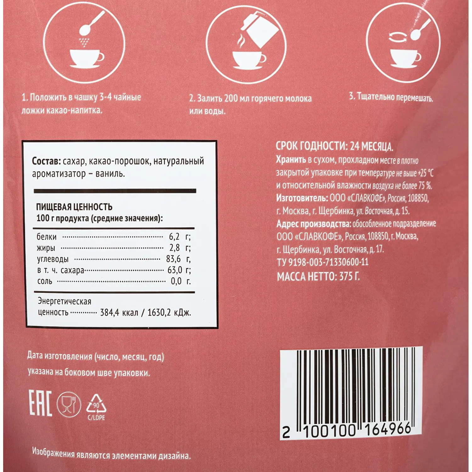 Состав: сахар, какао-порошок, эмульгатор лецитин, соль пищевая, ароматизатор ванилин, аскорбиновая кислота (витамин С).