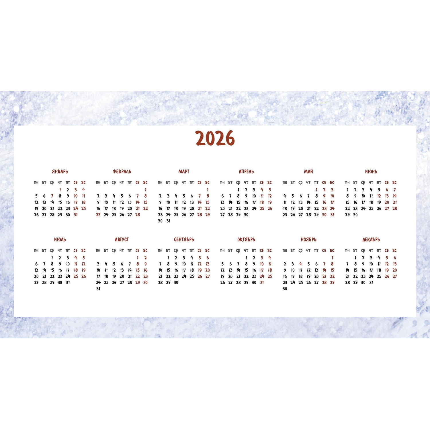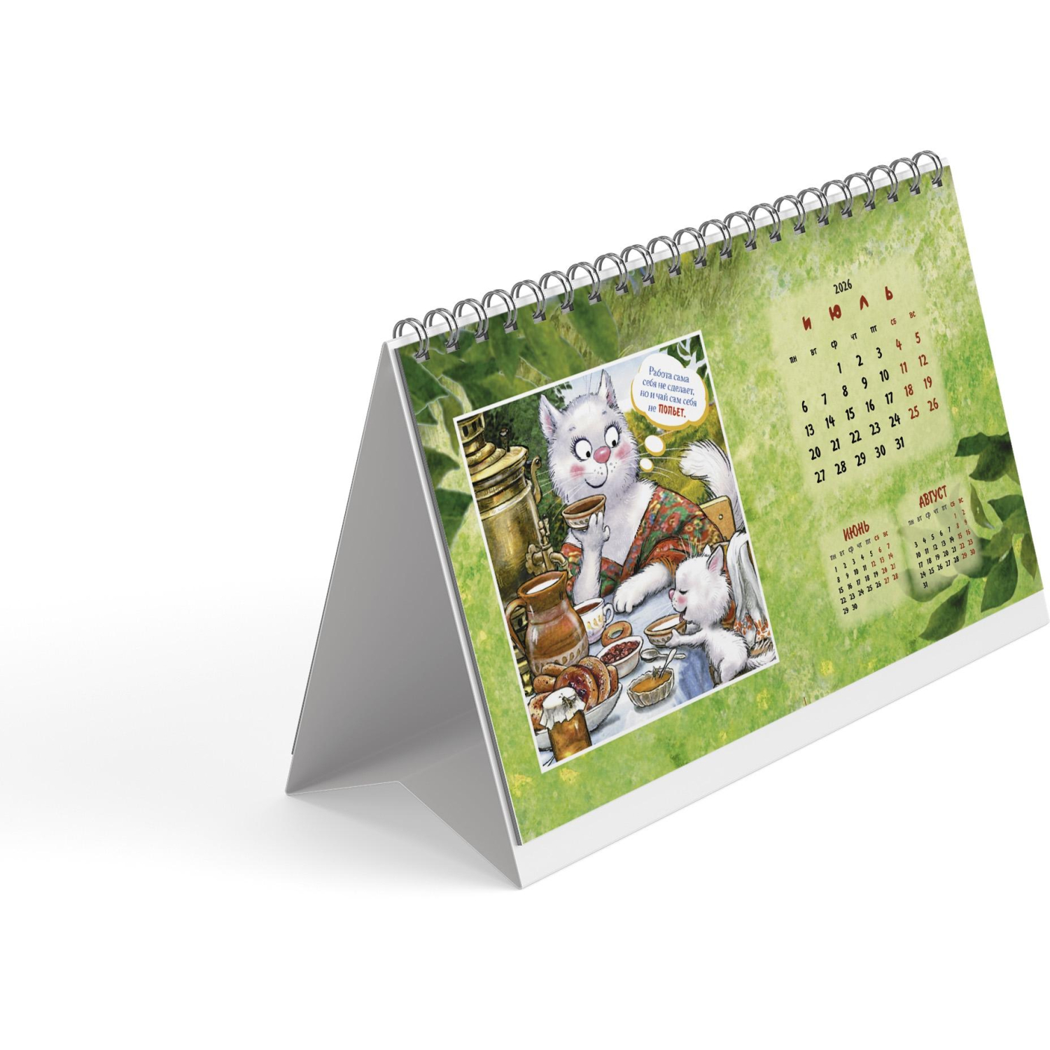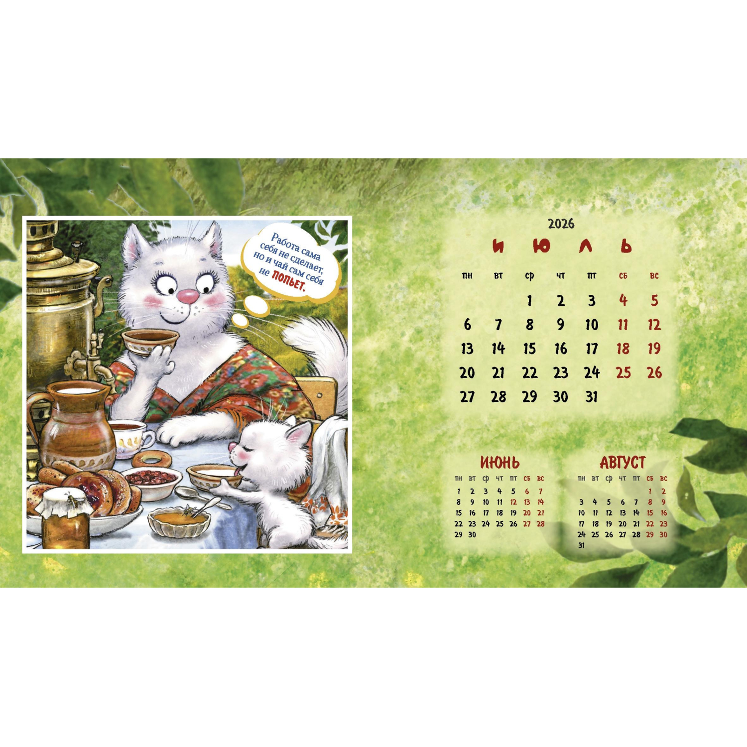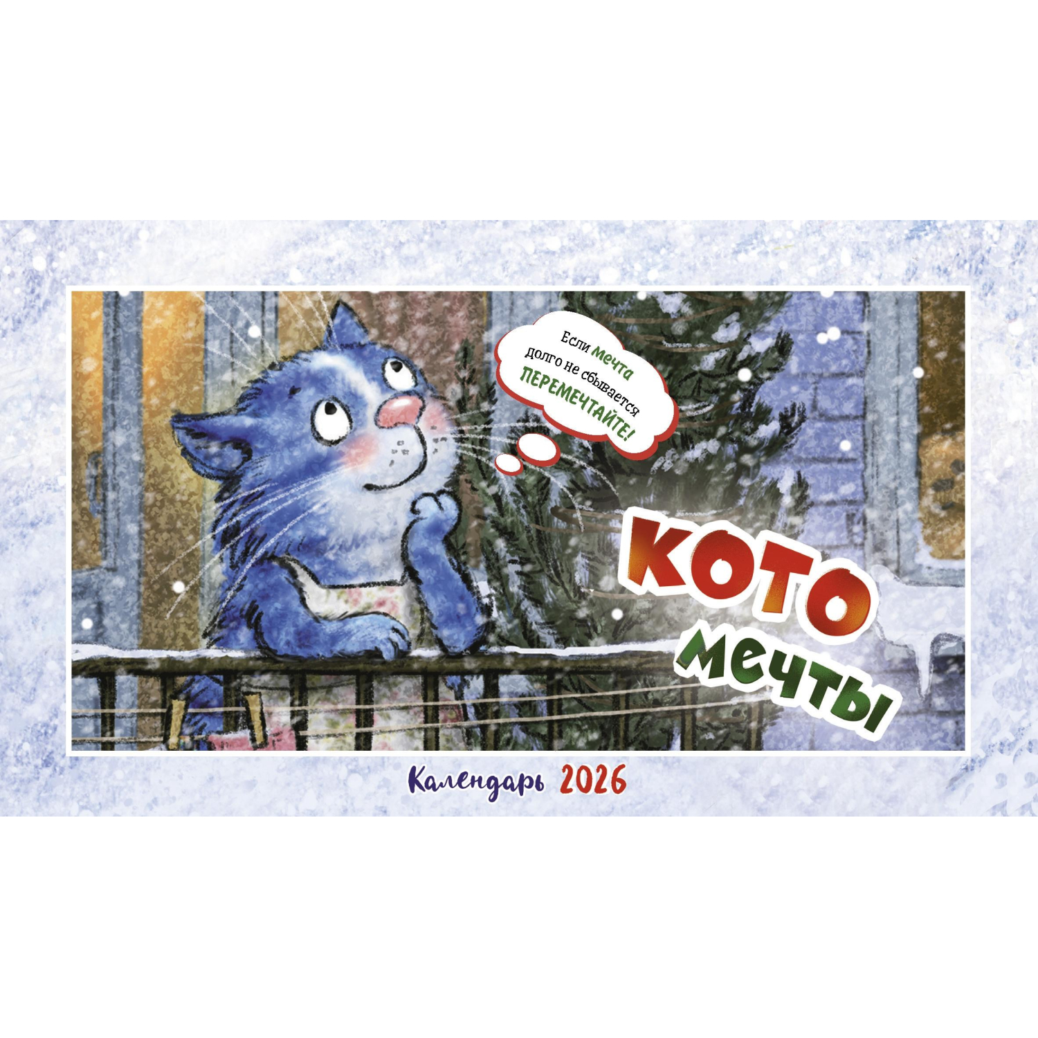 Настольный календарь на 2026 год. Формат 200×115 мм, 12 листов + 2 обложки, мелованная бумага, разрезная сетка, курсор, пружина, подложка: мелованный картон, место для рекламы 200×25 мм. Герои календаря — полюбившиеся синие коты Рины Зенюк.