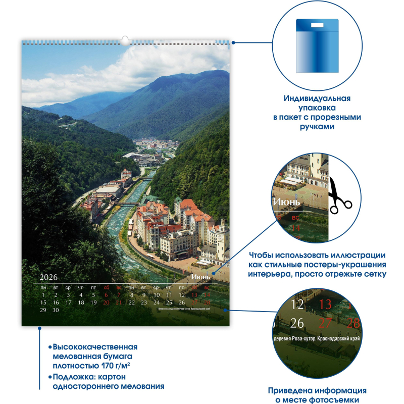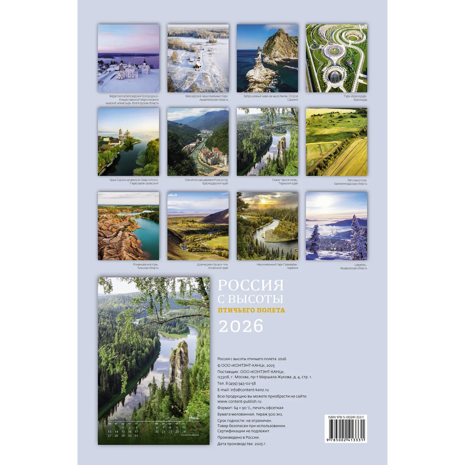 Настенный перекидной календарь на 2026 год. Формат 420×580 мм. Обложка мелованная матовая бумага 200 г/кв.м, глянцевая ламинация. Блок 8 листов, бумага мелованная матовая 170 г/кв.м. Крепление: пружина на одном ригеле. Упаковка: пакет полипропиленовый с вырубными ручками. Прекрасные фотографии русской природы с высоты птичьего полёта. На каждом фото указано место съёмки.