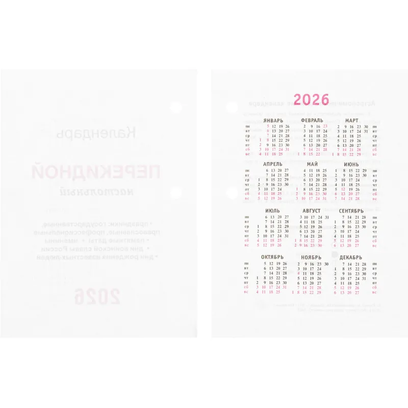 Настольный перекидной календарь, формат 100×140 мм, на офсетной бумаге плотностью 60 г/кв.м. Печать блока в 2 краски. Обложка: бумага мелованная плотностью 170 г/кв.м. Печать обложки в четыре краски.