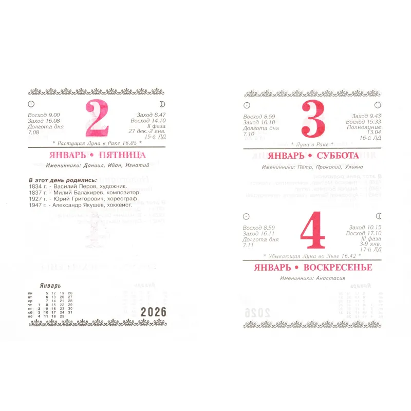 В календаре отмечены государственные, профессиональные, православные праздники, именины, знаменательные даты.