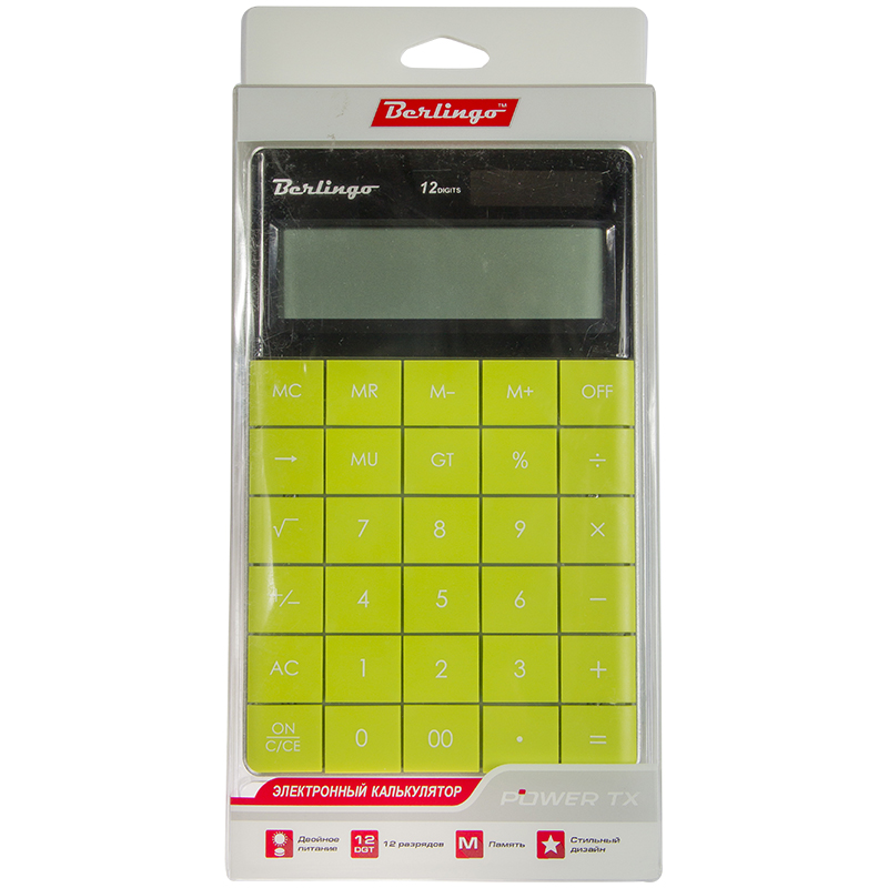 Настольный калькулятор Berlingo серия Power TX предназначен для выполнения арифметических операций и отображает 12 разрядов. Оптимальный набор функций поможет автоматизировать расчёты: вычисление квадратного корня, кнопка «00», функция смены знака, расчёт наценки, функция итогового суммирования. Двойное питание (солнечная батарея + батарея AG13(L44, L1154F)) и автоматическое отключение увеличивают срок службы. Размер калькулятора – 165*105*13 мм, вес – 202 г, цвет – зелёный. Изготовлен из противоударного пластика и отличается большим дисплеем с увеличенными символами для комфортной работы. Гарантийный срок - 3 года (кроме внутренних элементов питания).