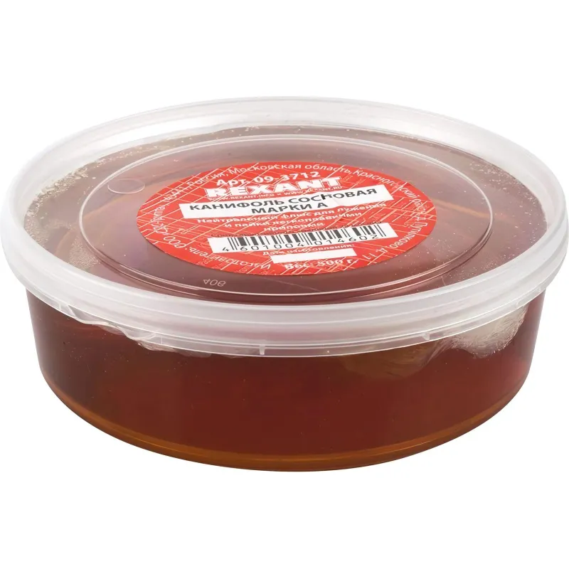 Канифоль сосновая марки, А 500 г REXANT предназначена для удаления тонких и нестойких оксидов с поверхности под пайку, улучшения растекания жидкого припоя при пайке печатных плат и радиокомпонентов. Канифоль — хрупкое, стекловидное вещество