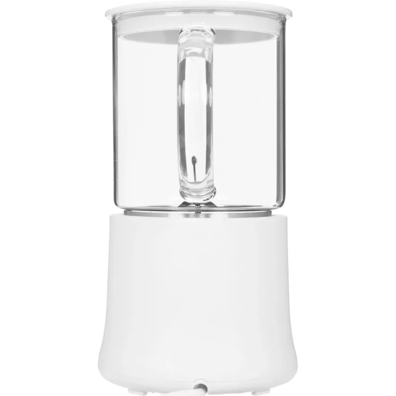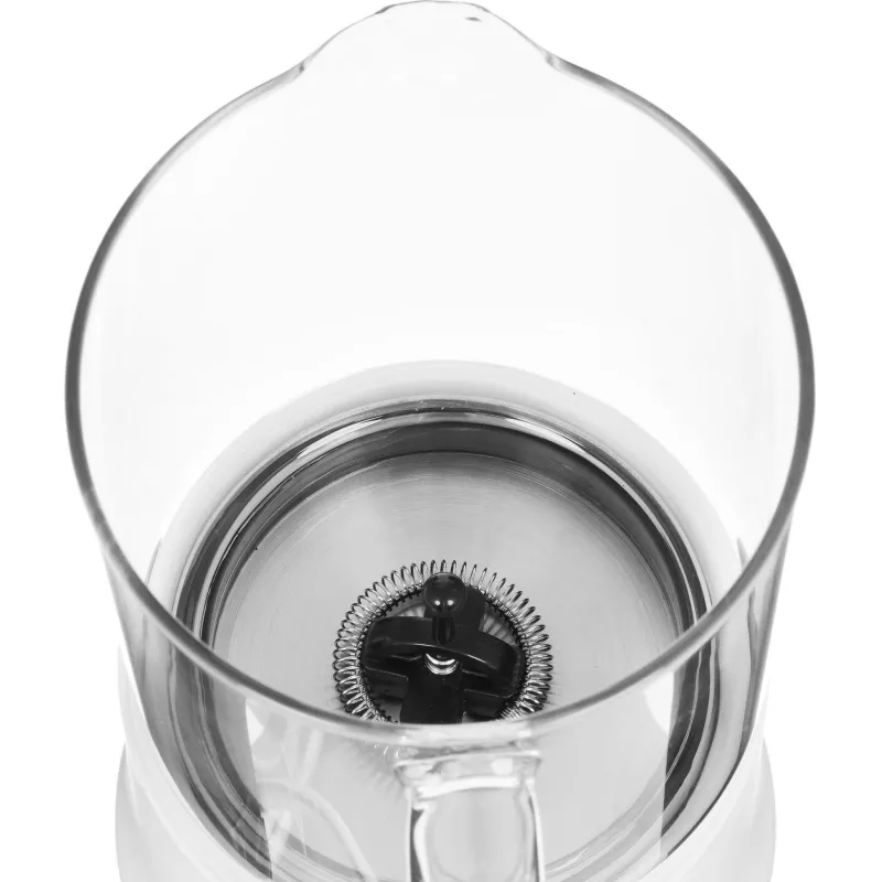 В комплект входят две насадки: с пружинкой для образования пенки и без неё — для приготовления горячего шоколада или смешивания напитков. На корпусе нанесена мерная шкала, позволяющая контролировать объём жидкости.
