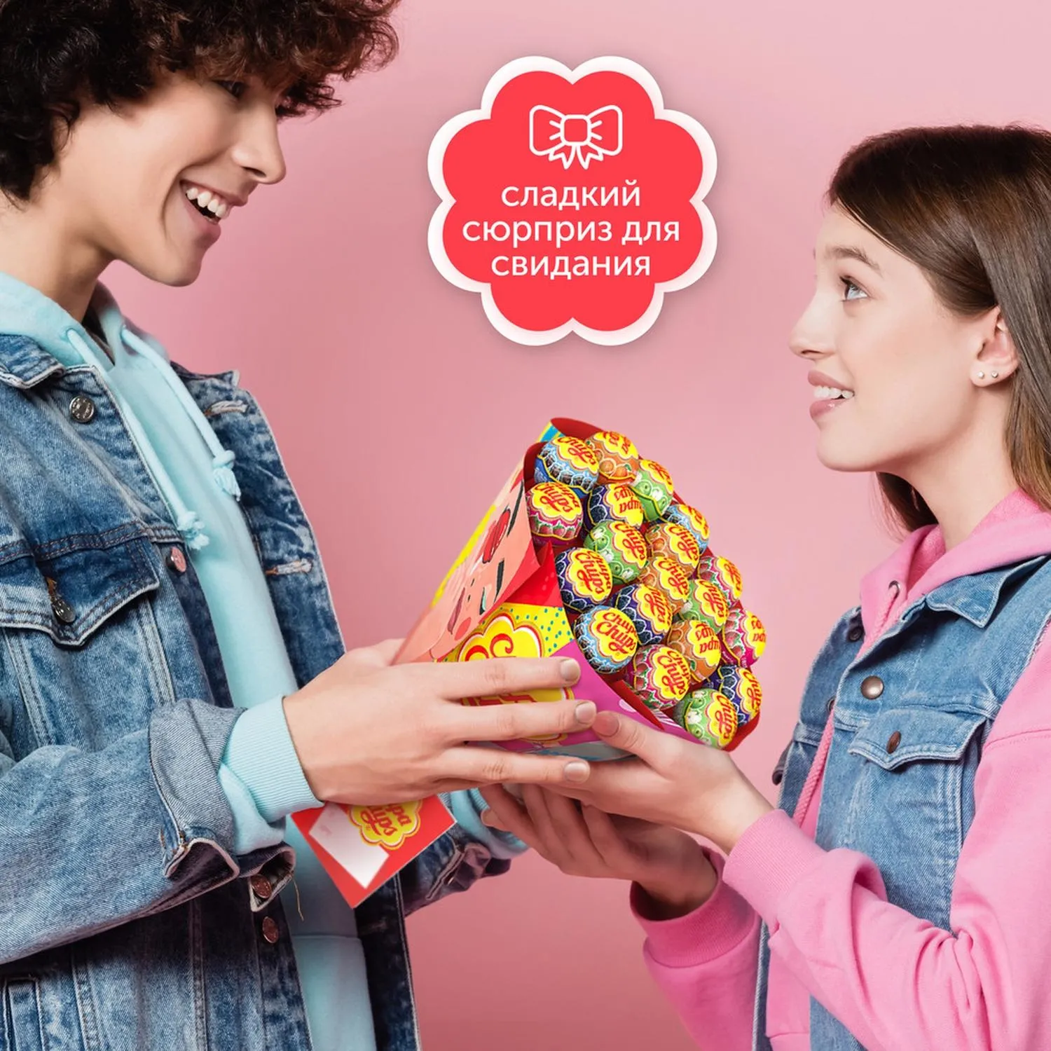 Набор карамели представляет собой леденцы на палочке с фруктовыми вкусами. Внутри — классические вкусы клубники, зелёного яблока, апельсина, ежевики и колы. Продукт оформлен в виде яркого букета, который можно подарить вместо цветов. Упаковка подчёркивает праздничный характер набора и делает его удобным для вручения.
