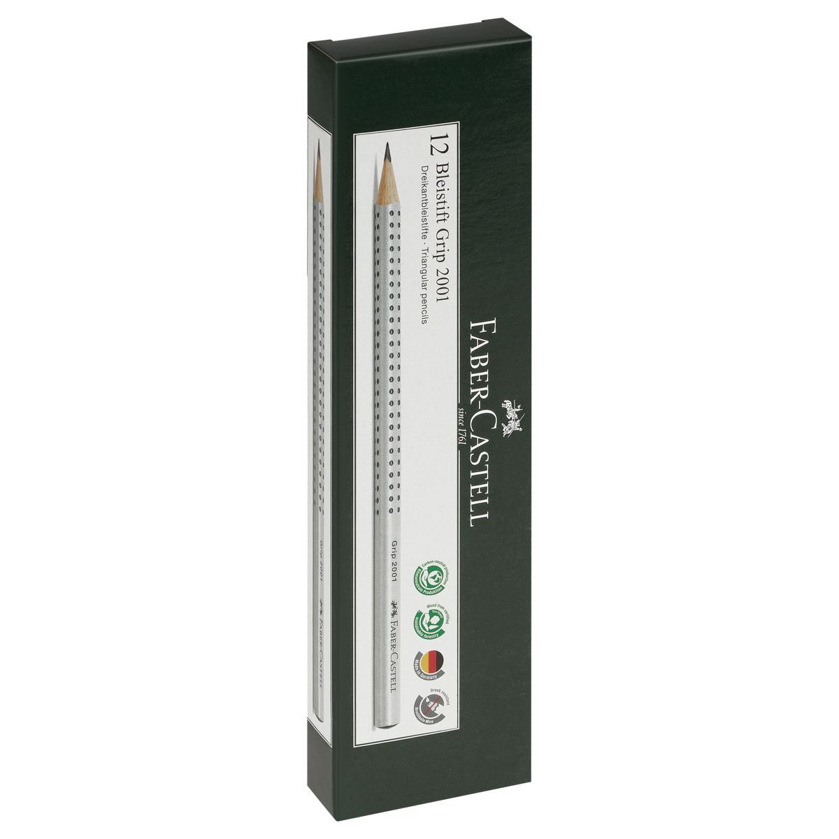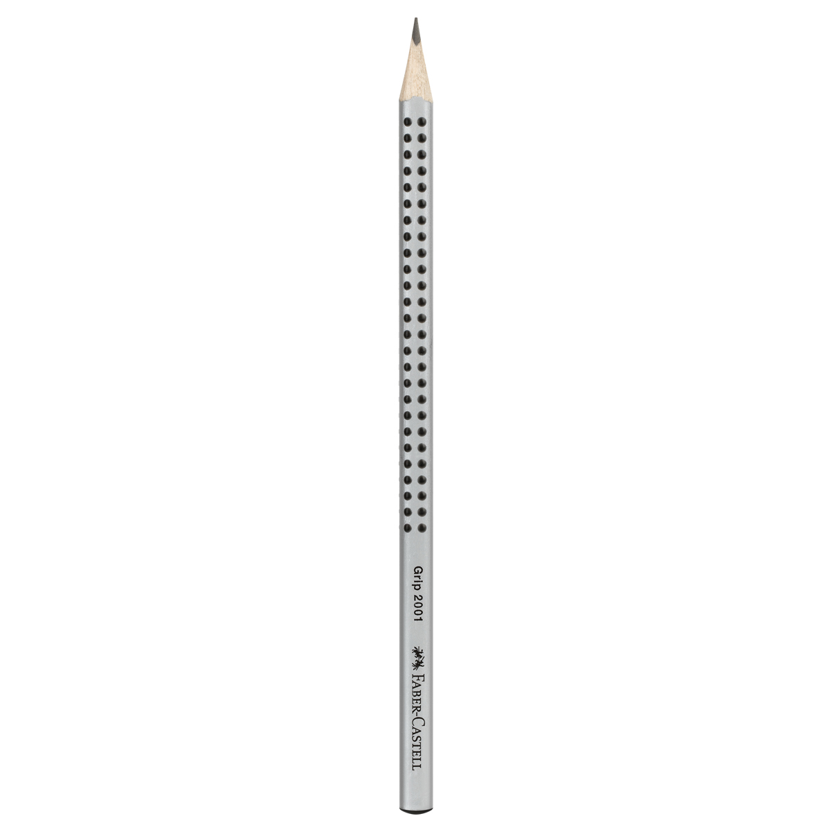 Запатентованное покрытие корпуса делает карандаш Grip 2001 от немецкого производителя Faber-Castell уникальным. Его трехгранная форма снижает напряжение руки, а нанесенный на корпус объемный рисунок предотвращает скольжение пальцев. Корпус серого цвета покрыт экологически чистым лаком на водной основе. Благодаря специальной технологии проклеивания грифеля (SV), грифель не ломается при падении и затачивании. Твердость: HB.