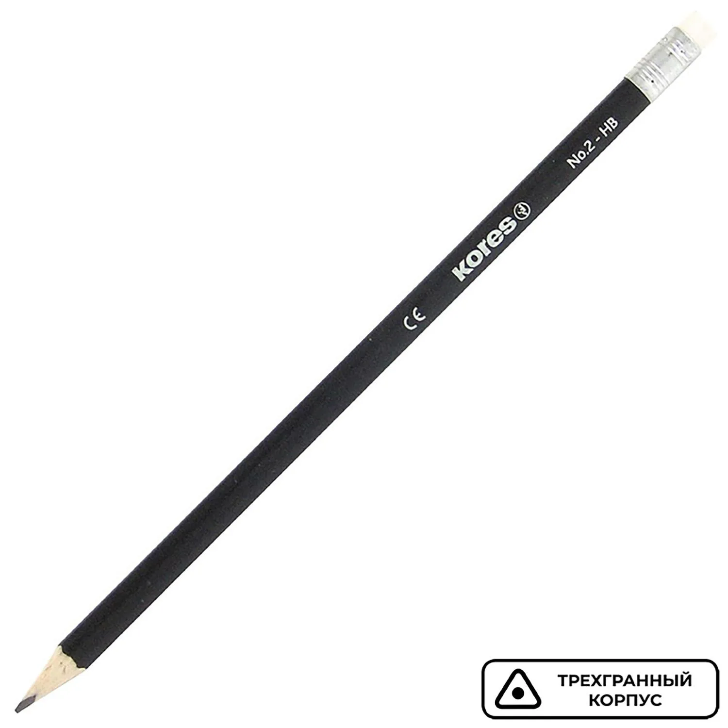 Карандаш чернографитный HB с ластиком Kores заточенный трехгранный