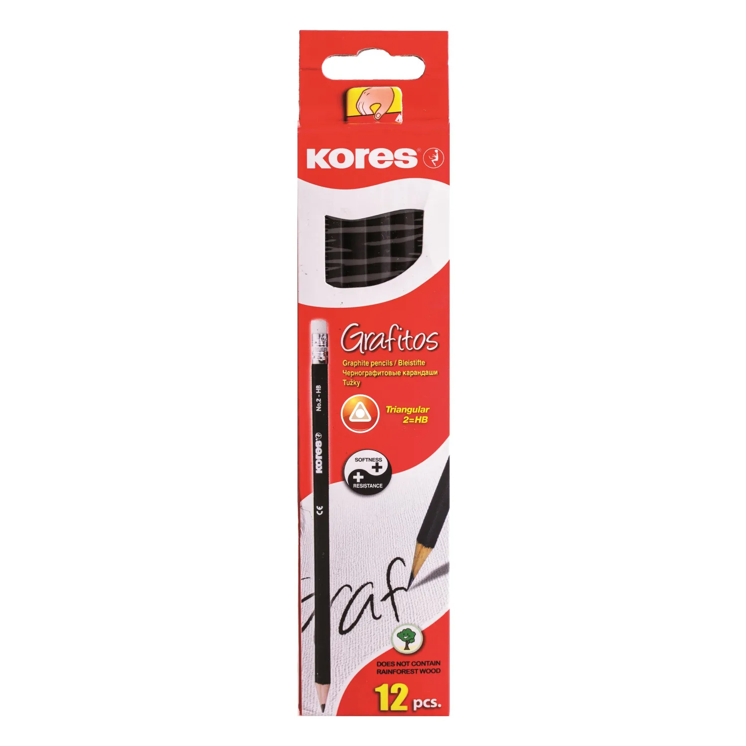 Карандаш чернографитный Kores в черном трехгранном деревянном корпусе. Простые карандаши с ластиком поставляются заточенными. Твердость грифеля — HB. Высококачественный и прочный, грифель не сломается даже при падении и ударе. Длина карандаша — 185 мм.