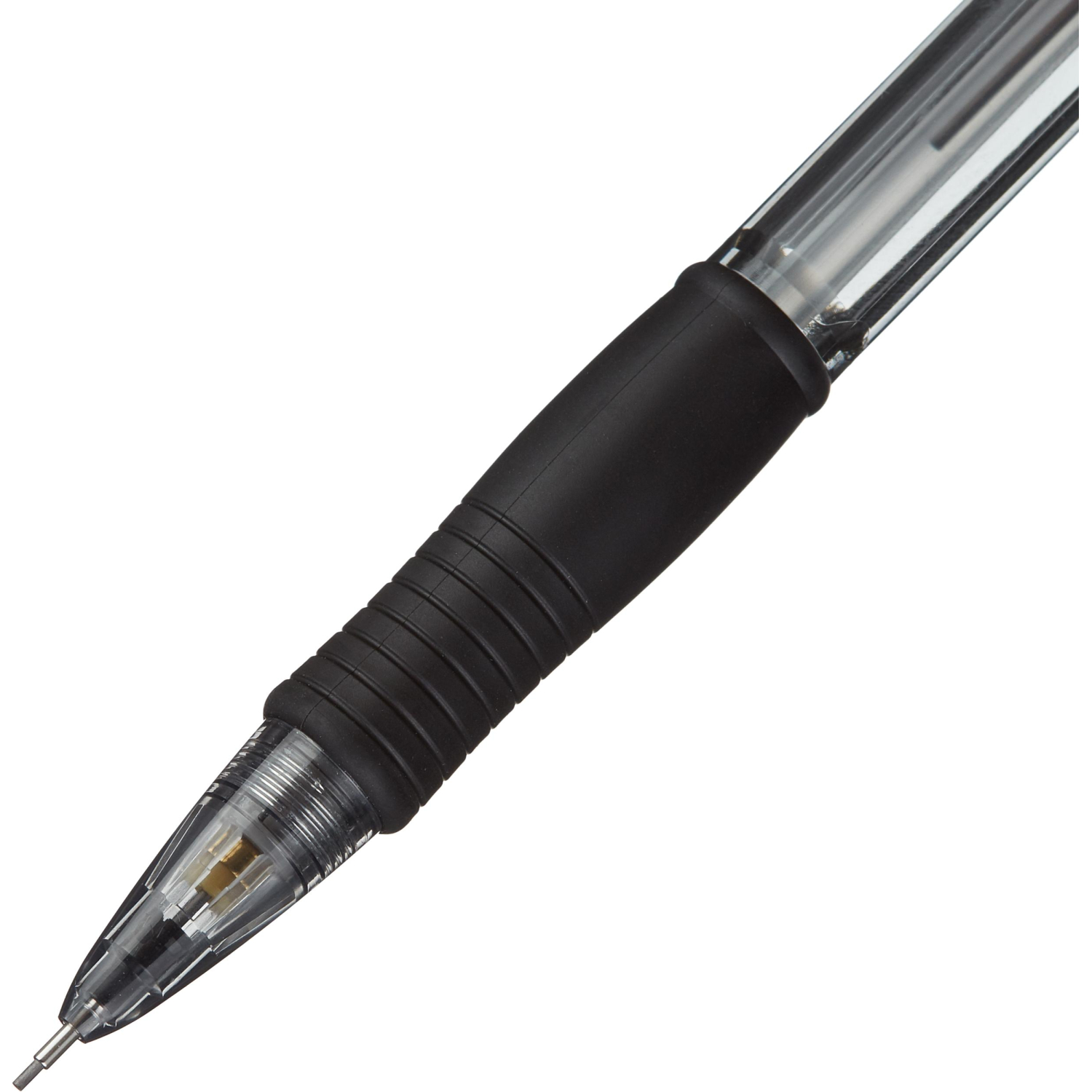 Карандаш механический в прозрачном пластиковом корпусе с резиновым упором, препятствующим выскальзывание карандаша из пальцев, и убирающейся металлической цангой. Корпус - пластик, цвет элементов - черный. Толщина грифеля - 0,7 мм, твердость грифеля - HB.