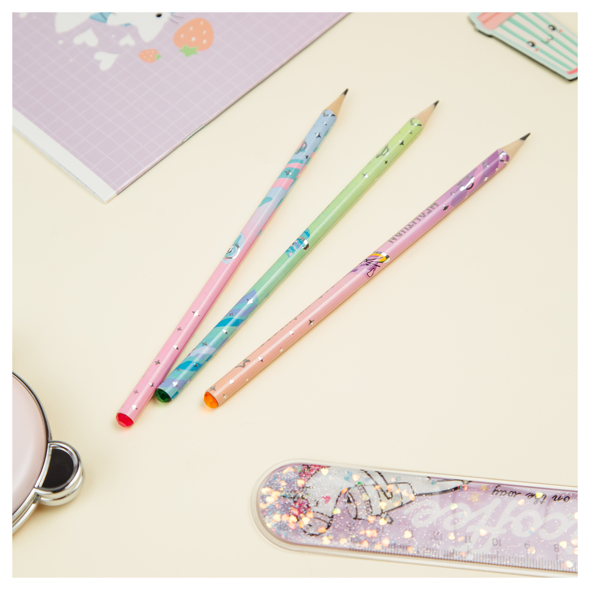 О товаре «Карандаш ч/г MESHU "Meowspace", HB, заточен., c фольгированием, стразы на топе, без ластика, ассорти, туба»