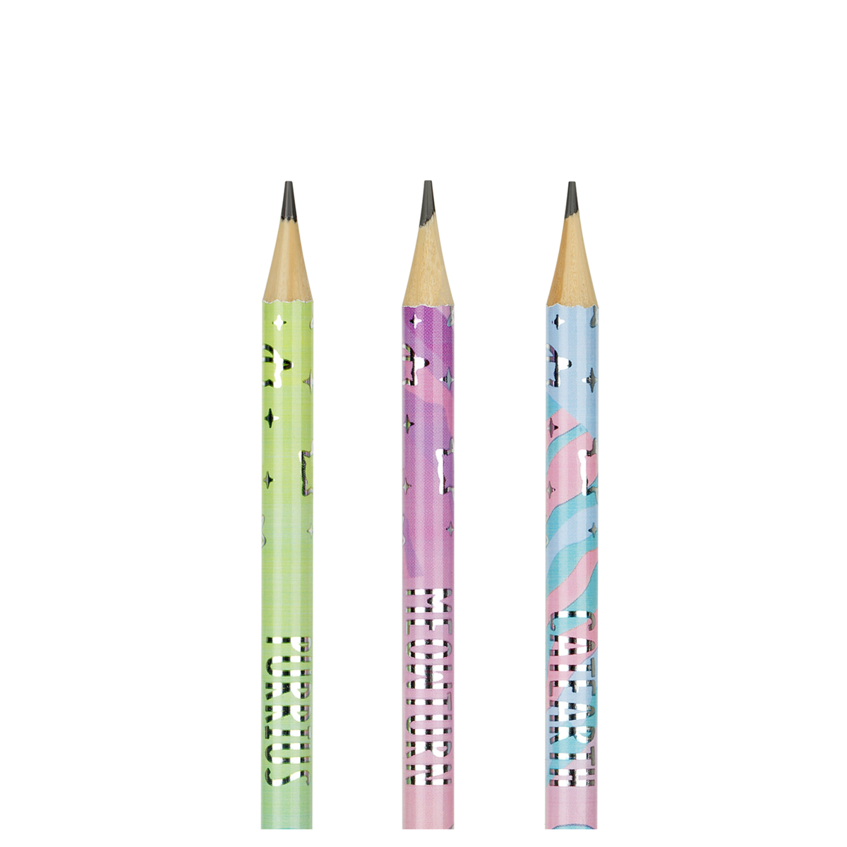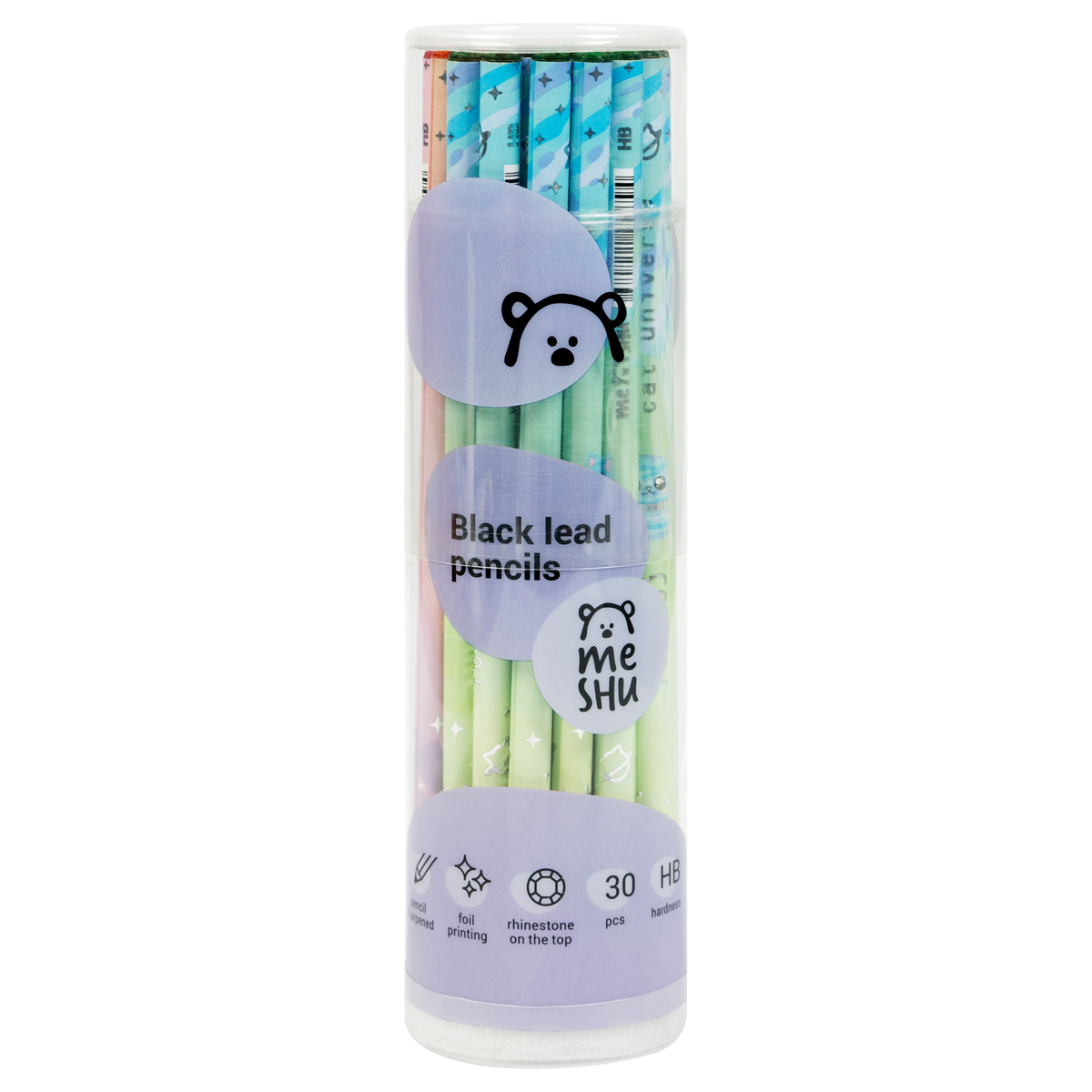 Чернографитные карандаши MESHU с фольгированной печатью на корпусе и стразами на топе станут лучшими помощниками в школе или офисе. Карандаши представлены в круглом корпусе в тех разных дизайнах и упакованы в пластиковую тубу по 30 штук. Твердость грифеля – HB, диаметр – 2,2 мм, длина карандаша – 179 мм. Изготовлены из светлого дерева.