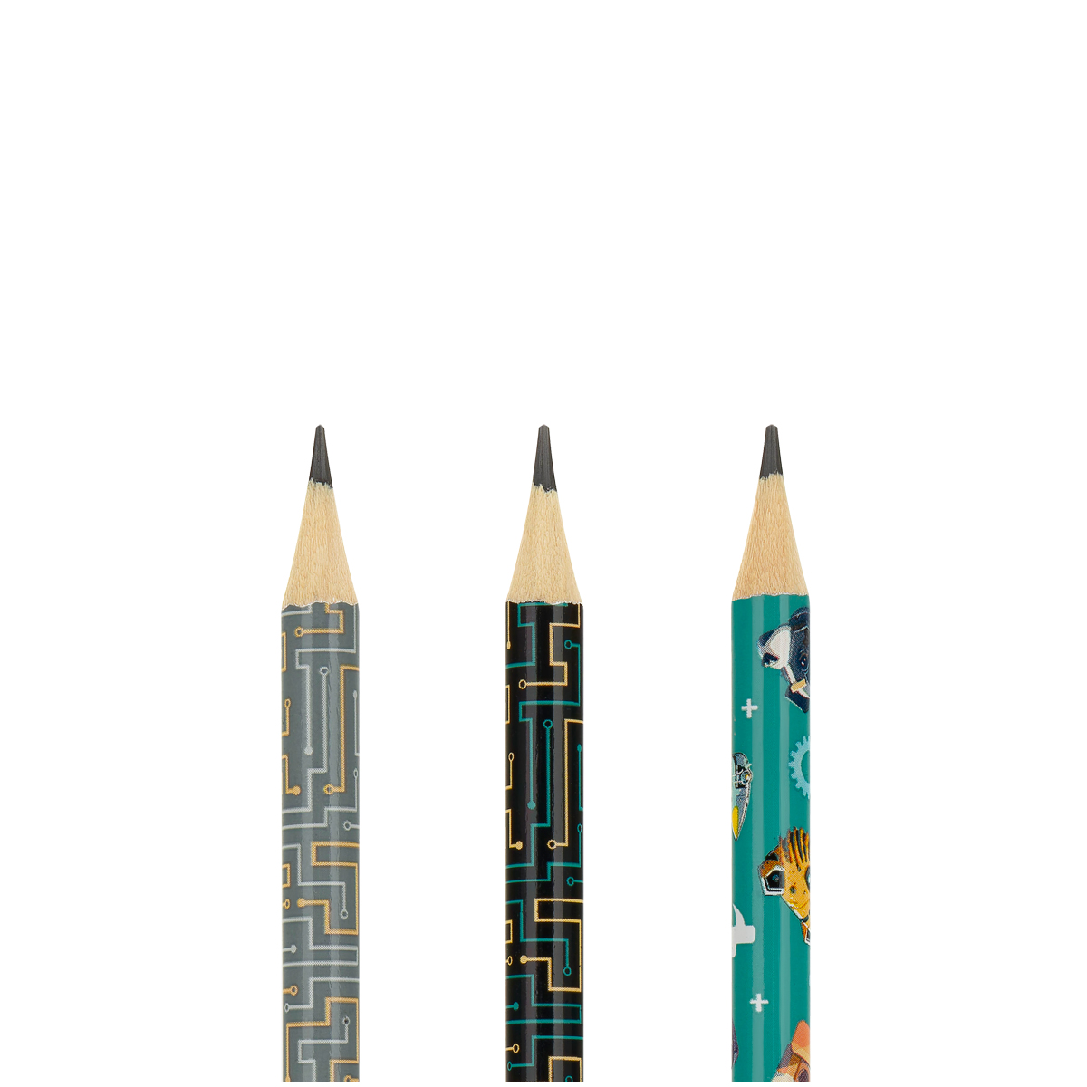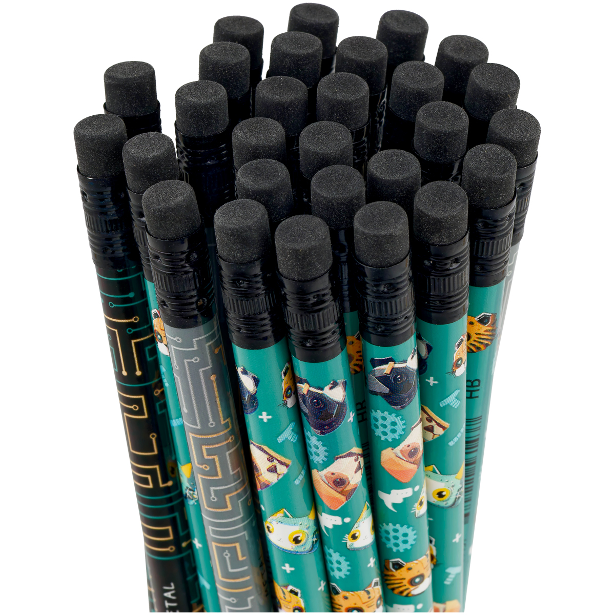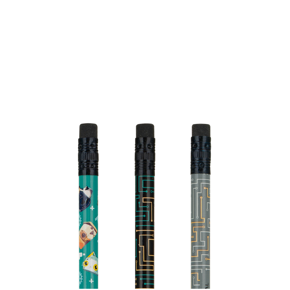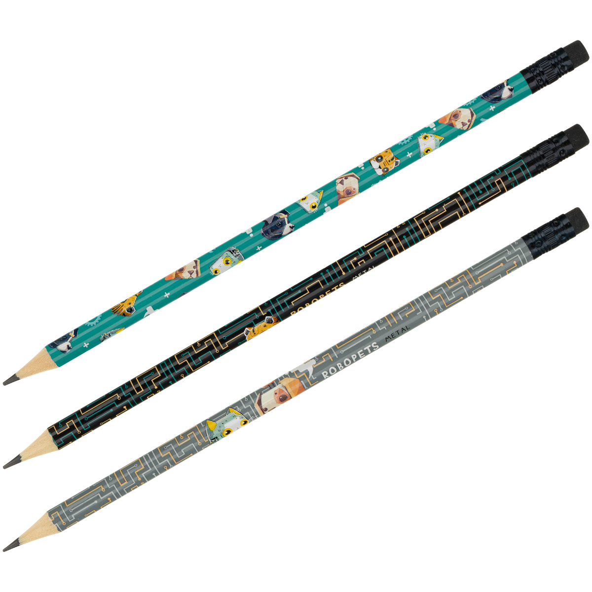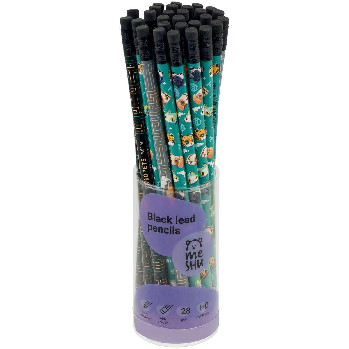 Чернографитные карандаши MESHU "Robopets" с печатью на корпусе и чёрным ластиком — аксессуары, которые не дадут заскучать на учёбе или работе. Они представлены в круглом корпусе с тремя разными дизайнами. Твёрдость грифеля — HB. Длина карандаша — 190 мм. Диаметр — 2,2 мм.