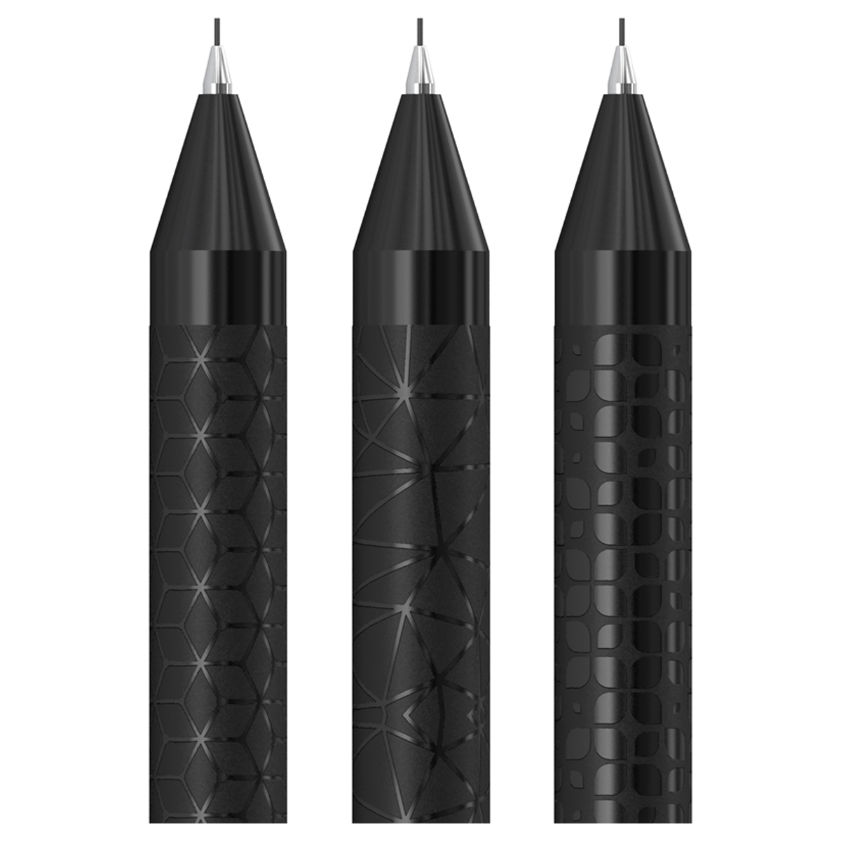 Механический карандаш с дизайном стильной кросс-продуктовой серии DoubleBlack выглядит строго, но оригинально благодаря глянцевому узору на черном матовом фоне. Снабжён двумя запасными грифелями самого популярного диаметра 0,5 мм и встроенным ластиком. Подача грифеля осуществляется с помощью кнопочного механизма. Поставляется в пластиковой тубе по 30 штук.