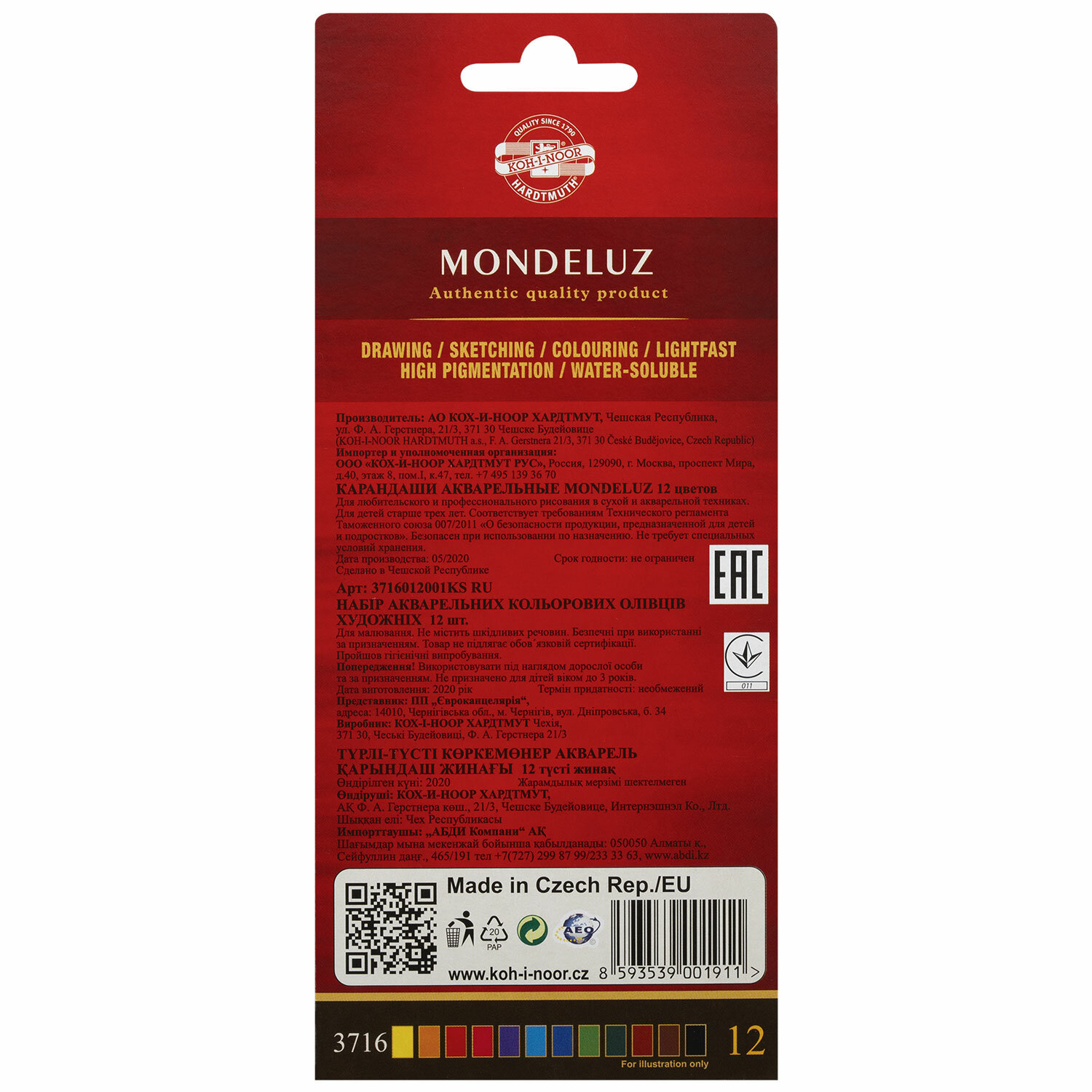 Карандаши цветные акварельные художественные KOH-I-NOOR "Mondeluz", 36 цветов, 3,8 мм, заточенные, европодвес, 3719036001KZRU