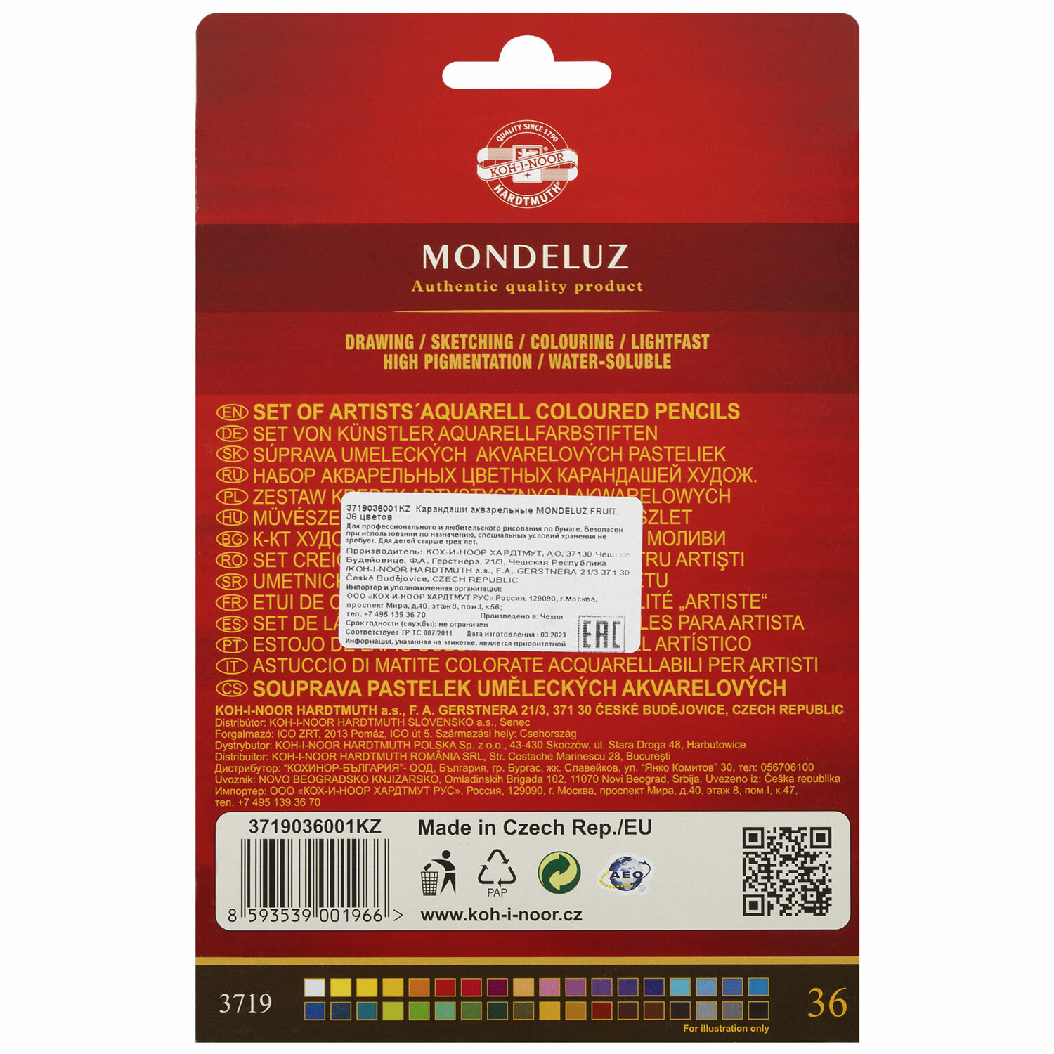 О товаре «Карандаши цветные акварельные художественные KOH-I-NOOR "Mondeluz", 36 цветов, 3,8 мм, заточенные, европодвес, 3719036001KZRU»