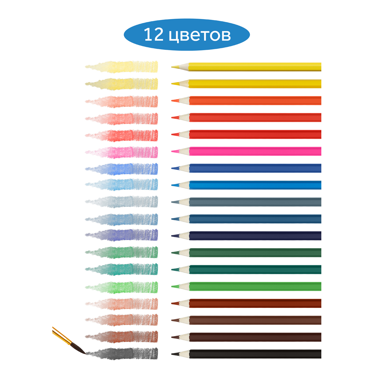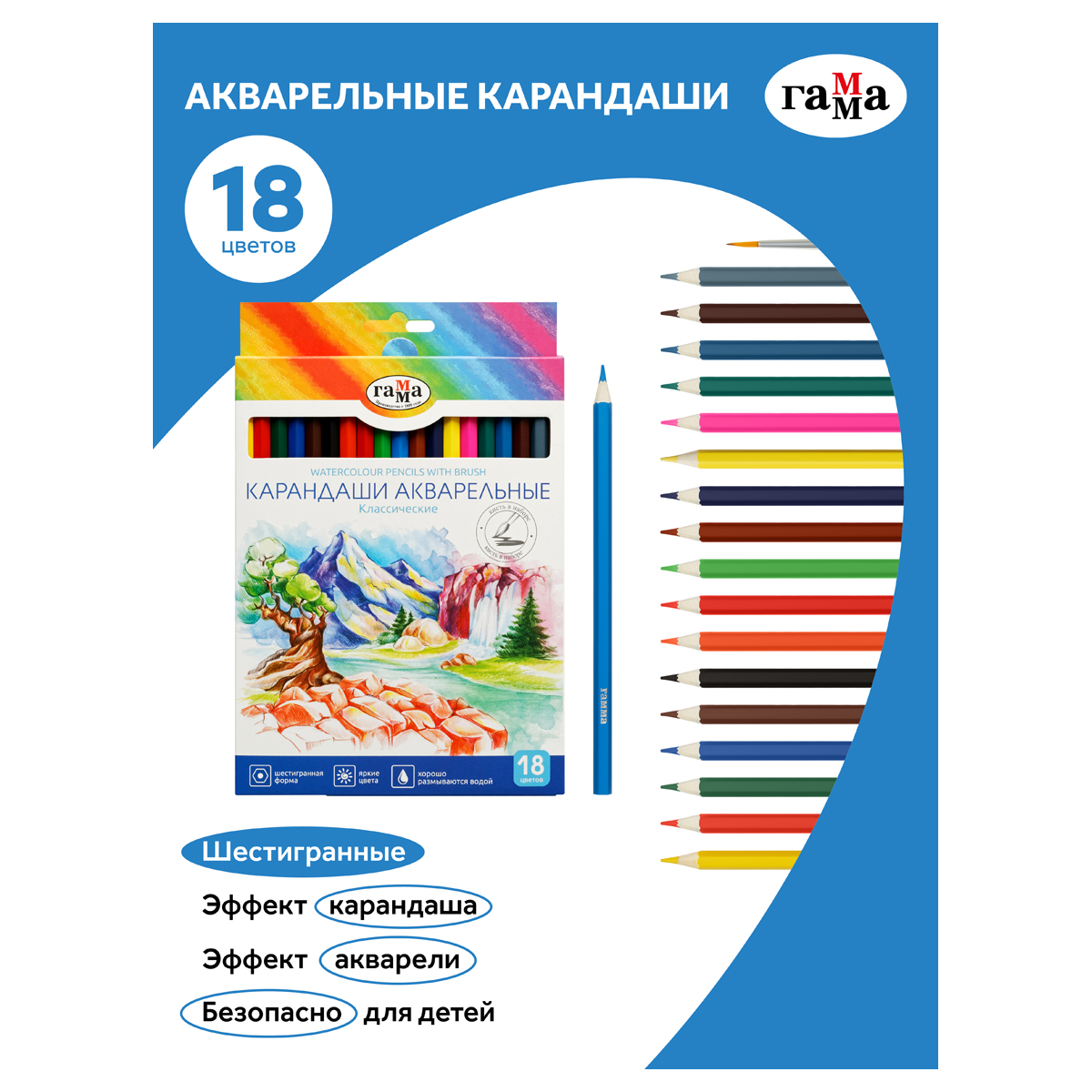 О товаре «Карандаши акварельные Гамма "Классические", 18цв., шестигранные, заточен., с кистью, картон. упак., европодвес»
