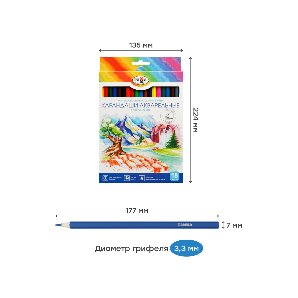Цветные акварельные карандаши ГАММА серии «Классическая» созданы специально для детей, которые уже чувствуют себя настоящими художниками. В наборе 18 ярких и насыщенных цветов. Увеличенный диаметр грифеля – 3,3 мм. Акварельные карандаши «Классические» обладают свойствами цветных карандашей и акварели. Благодаря водорастворимому связующему в составе они отличаются хорошей размываемостью. Тонкотертые пигменты обеспечивают чистые, насыщенные и равномерные цвета. Шестигранный корпус карандаша диаметром 7 мм и длиной 174 мм изготовлен из древесины специальной обработки, и его легко точить. В комплекте – высококачественная кисть «ГАММА» из синтетического волоса. Представлены в удобной упаковке в креативном дизайне.