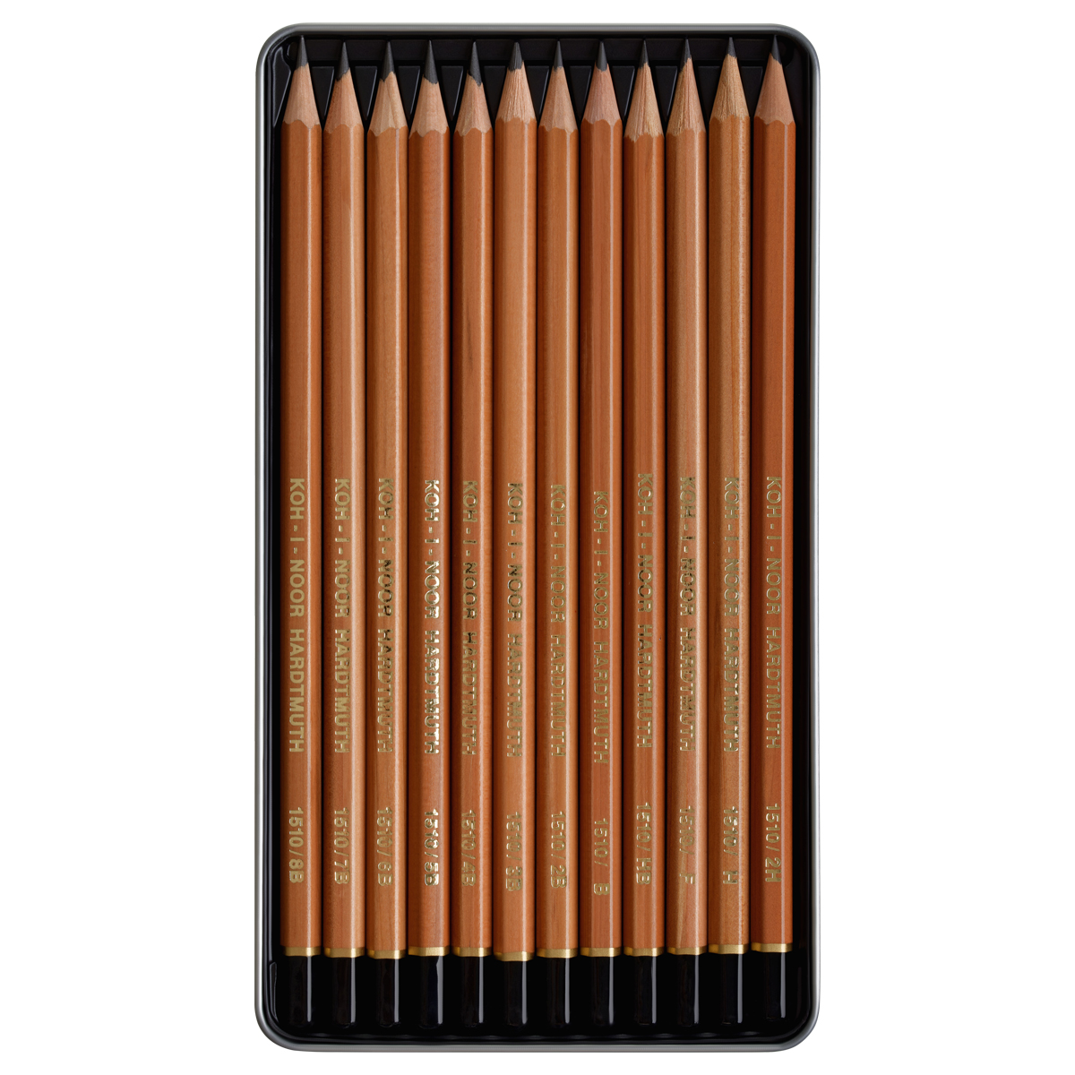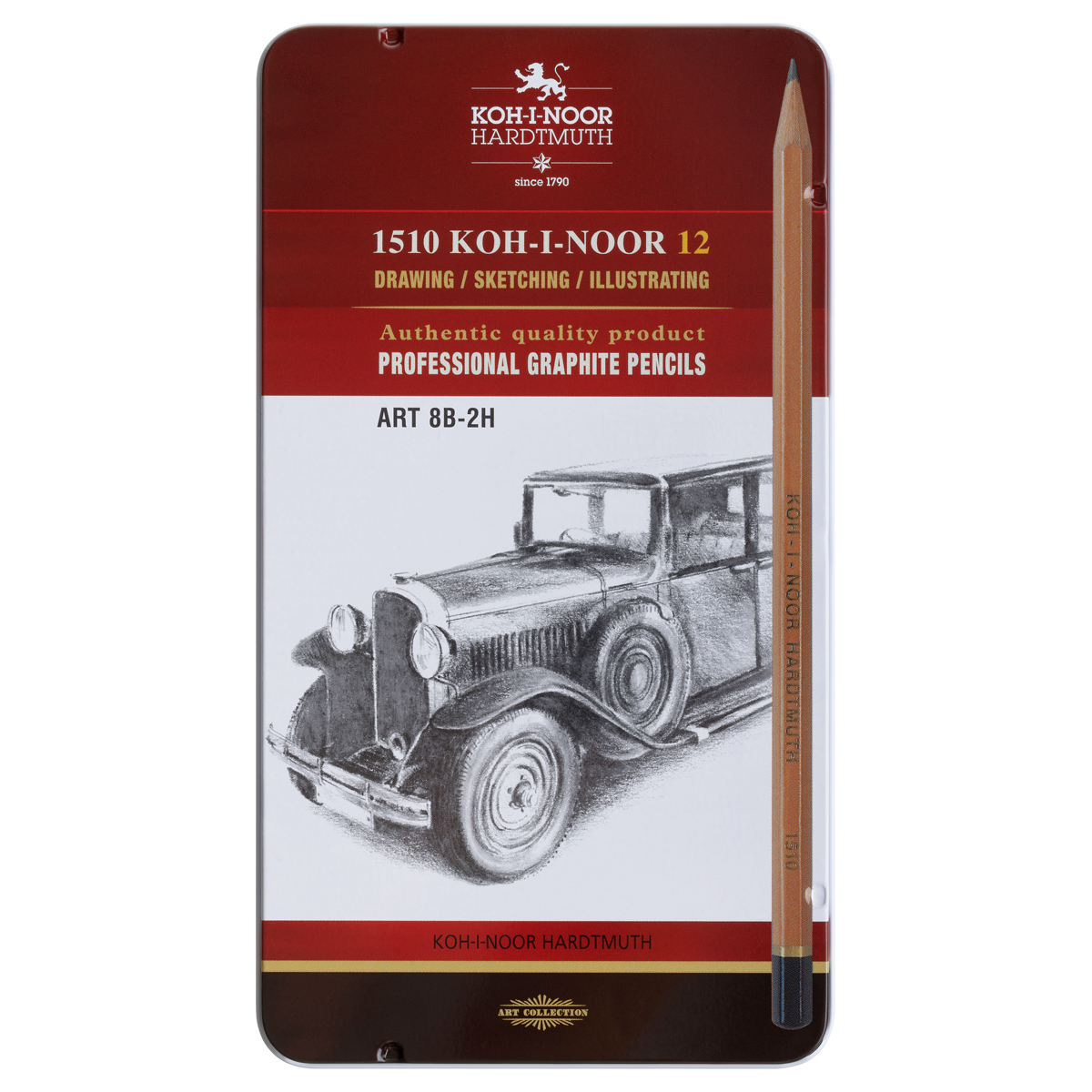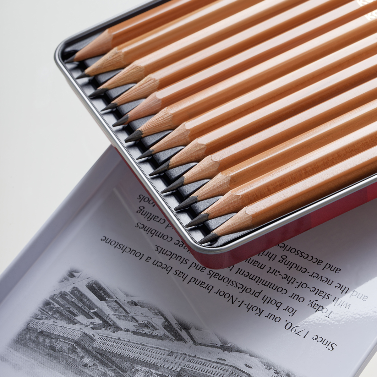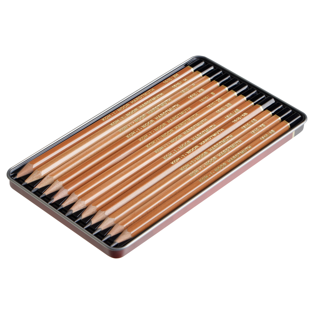 Карандаши длиной 175 мм, представленные в наборе, поставляюся без ластика, заточенными. Твердости грифеля - 2H-8B. Упаковка - металлическая коробка.