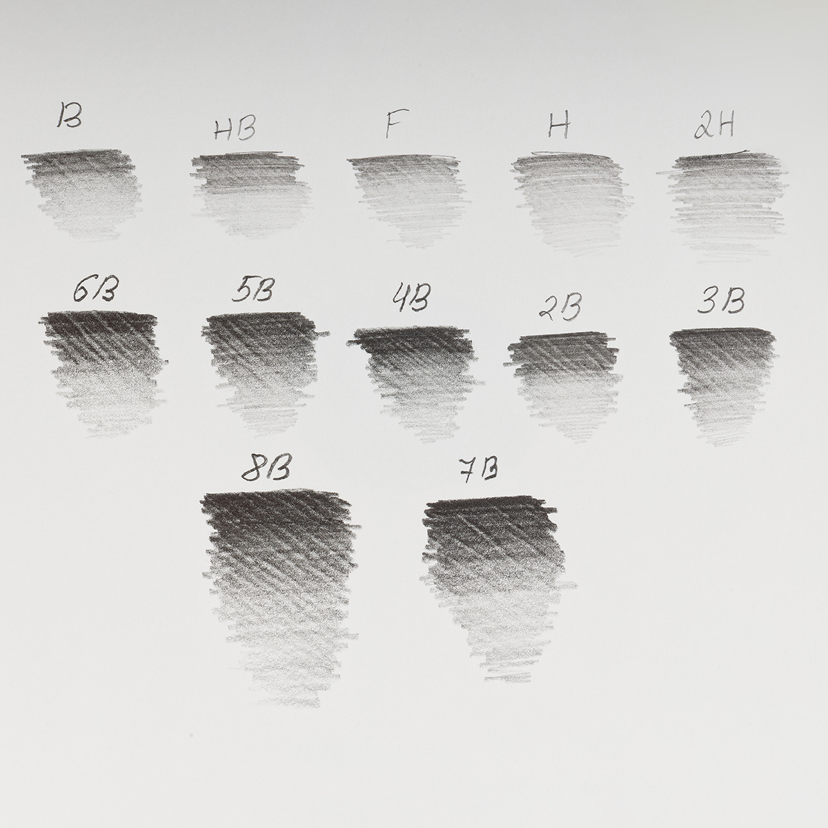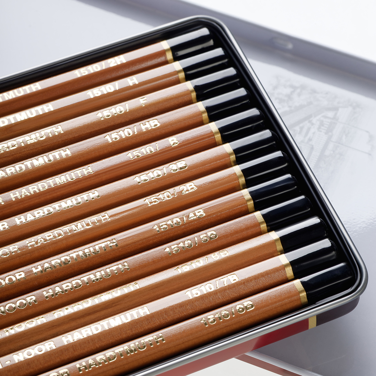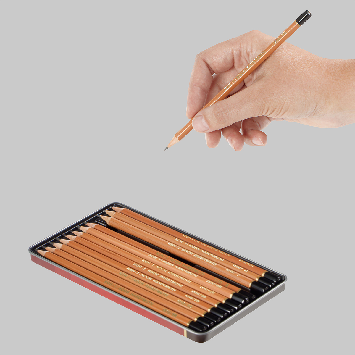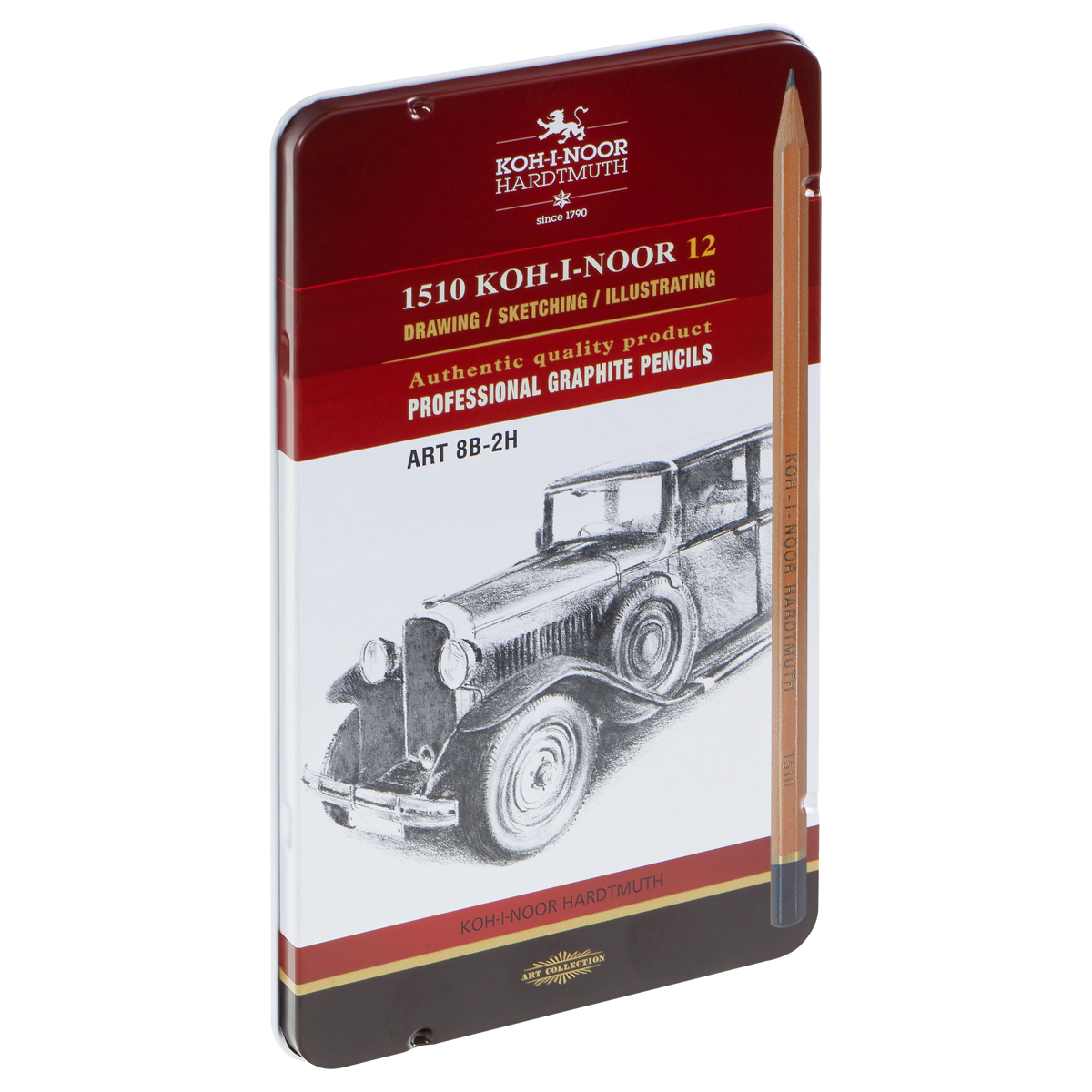 Карандаши длиной 175 мм, представленные в наборе, поставляюся без ластика, заточенными. Твердости грифеля - 2H-8B. Упаковка - металлическая коробка.