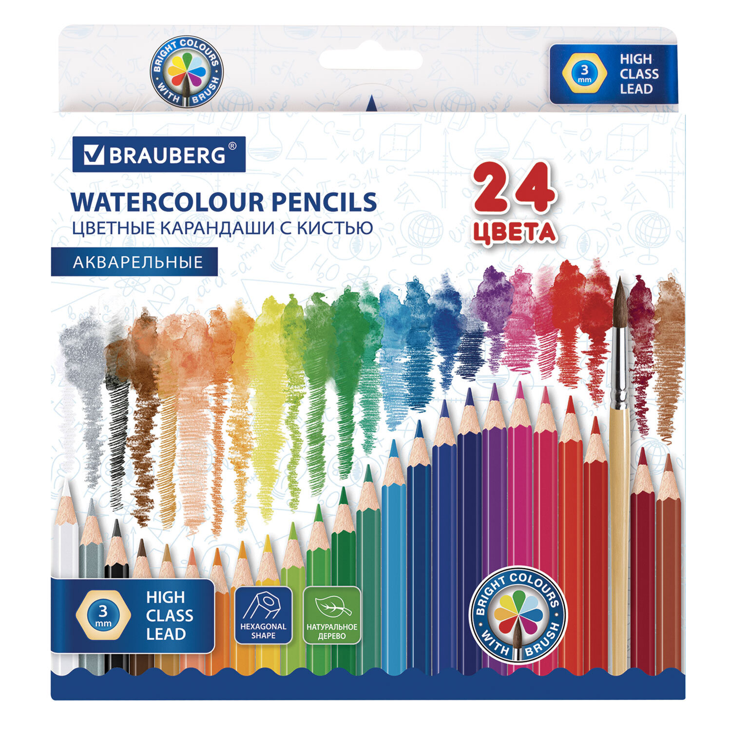 Карандаши цветные акварельные BRAUBERG 24 цвета с КИСТЬЮ, шестигранные, грифель 3 мм, натуральное дерево, 181849
