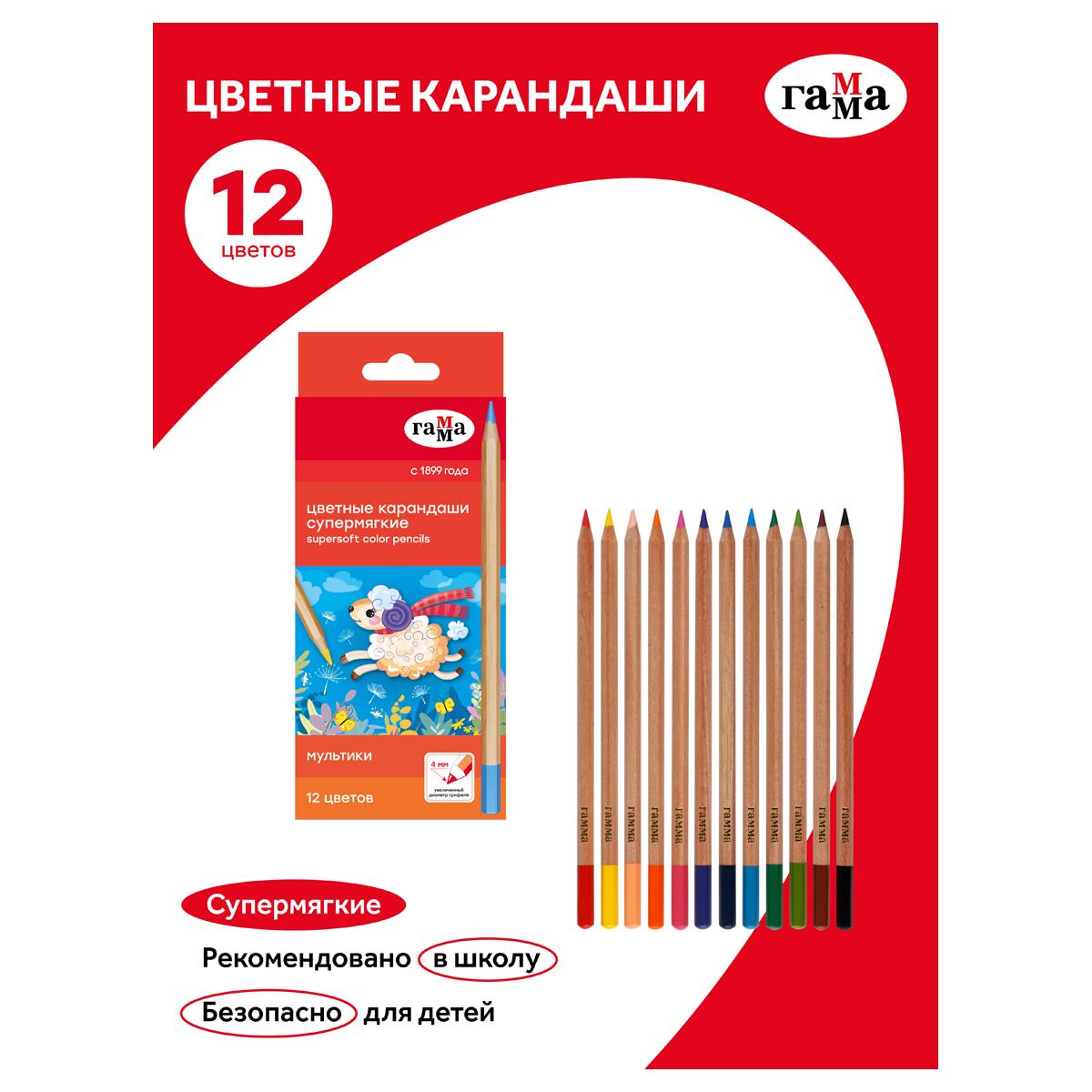 О товаре «Карандаши цветные Гамма "Мультики", 12цв., супермягкие, увелич. диаметр грифеля 4,0мм, заточен., картон. упак., европодвес»