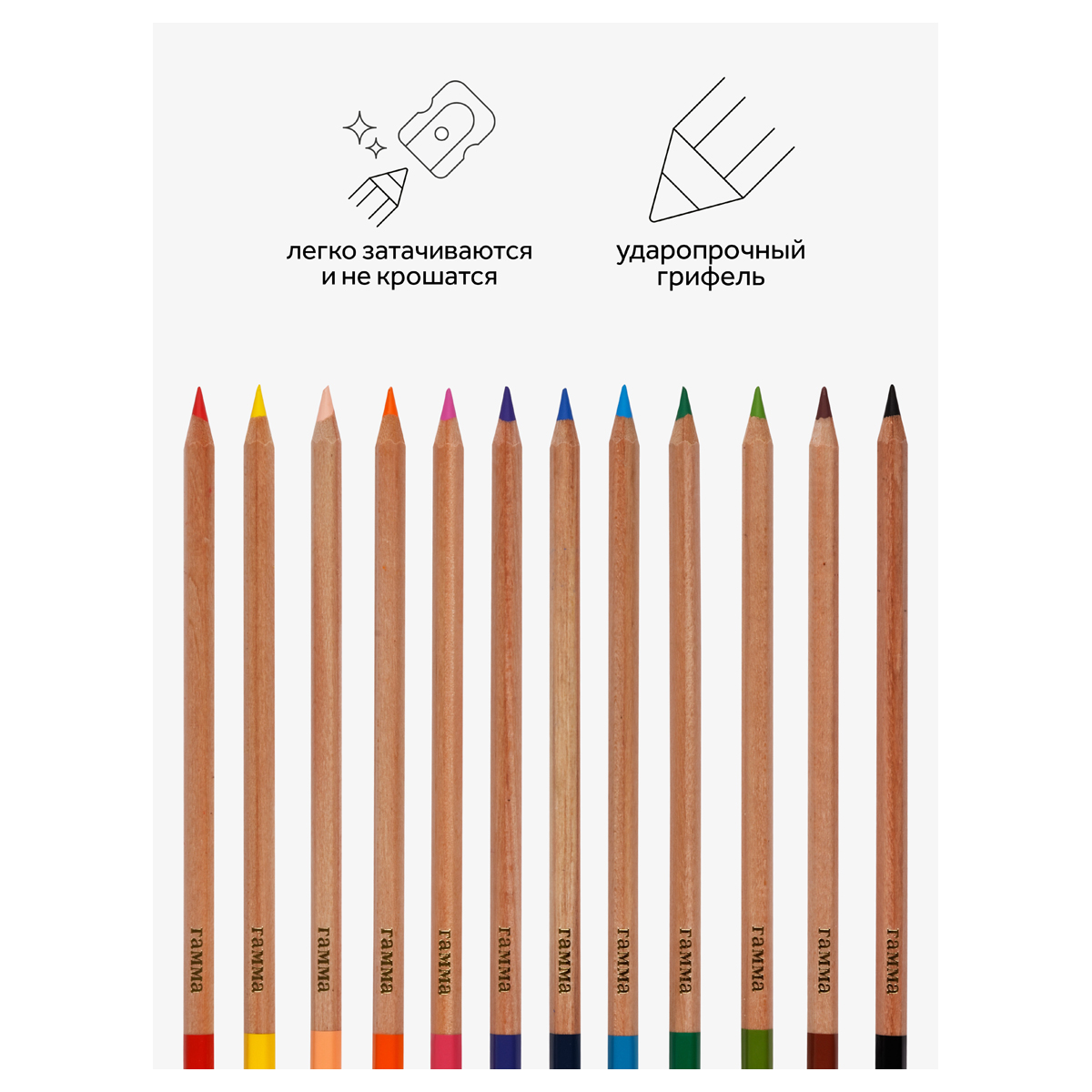 Супермягкие цветные карандаши ГАММА серии «Мультики» выполнены в шестигранном корпусе и благодаря грифелю премиум-качества отличаются легким скольжением и комфортным рисованием по бумаге любого типа. В наборе 12 цветов: желтый, оранжевый, коричневый, телесный, черный, голубой, фиолетовый, синий, салатовый, зеленый, розовый, красный. Увеличенный диаметр грифеля — 4 мм способствует легкой штриховке изображения. Ребенку не придется сильно давить на карандаш — рисунок получится ярким и равномерно закрашенным. Проклеенный ударопрочный грифель не крошится во время заточки и не ломается даже после падения. Корпус карандаша диаметром 7 мм и длиной 174 мм изготовлен из дерева. Специальная обработка древесины позволяет легко заточить карандаш без зазубрин и заноз. Упаковка – картонная коробка с европодвесом.