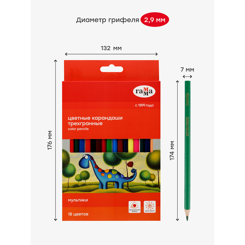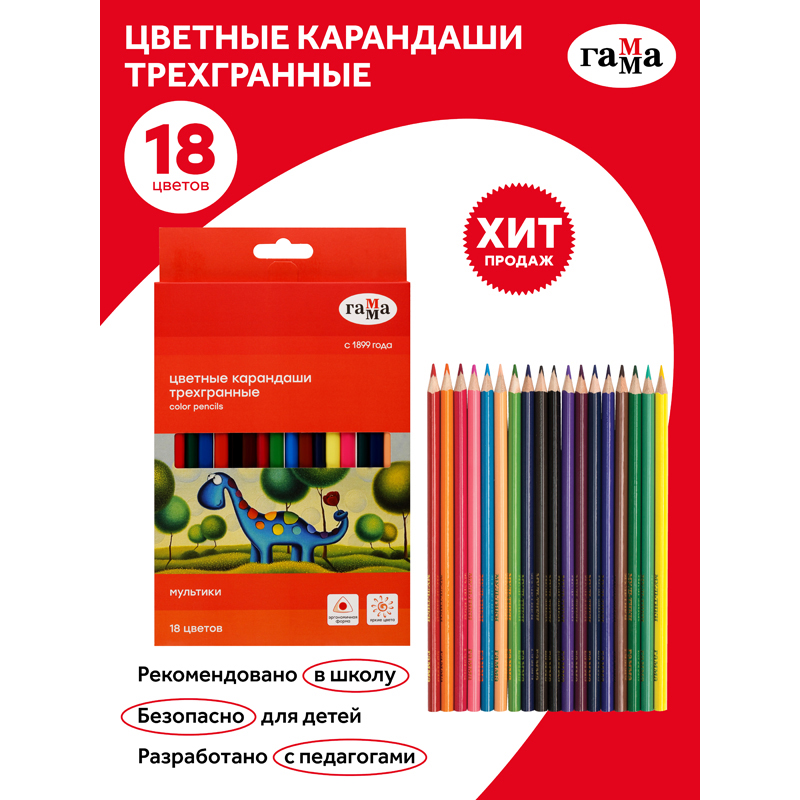 Карандаши цветные Гамма Мультики 18 карандашей 18 цветов трёхгранные