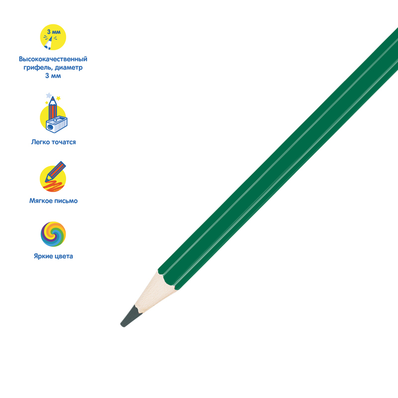 Карандаши цветные с заточенным грифелем. Яркие насыщенные цвета. Штрихи мягко ложатся на бумагу. Карандаши легко затачиваются. Упакованы в картонную лакированную коробку со склеенным европодвесом. Для детей старше 3-х лет.