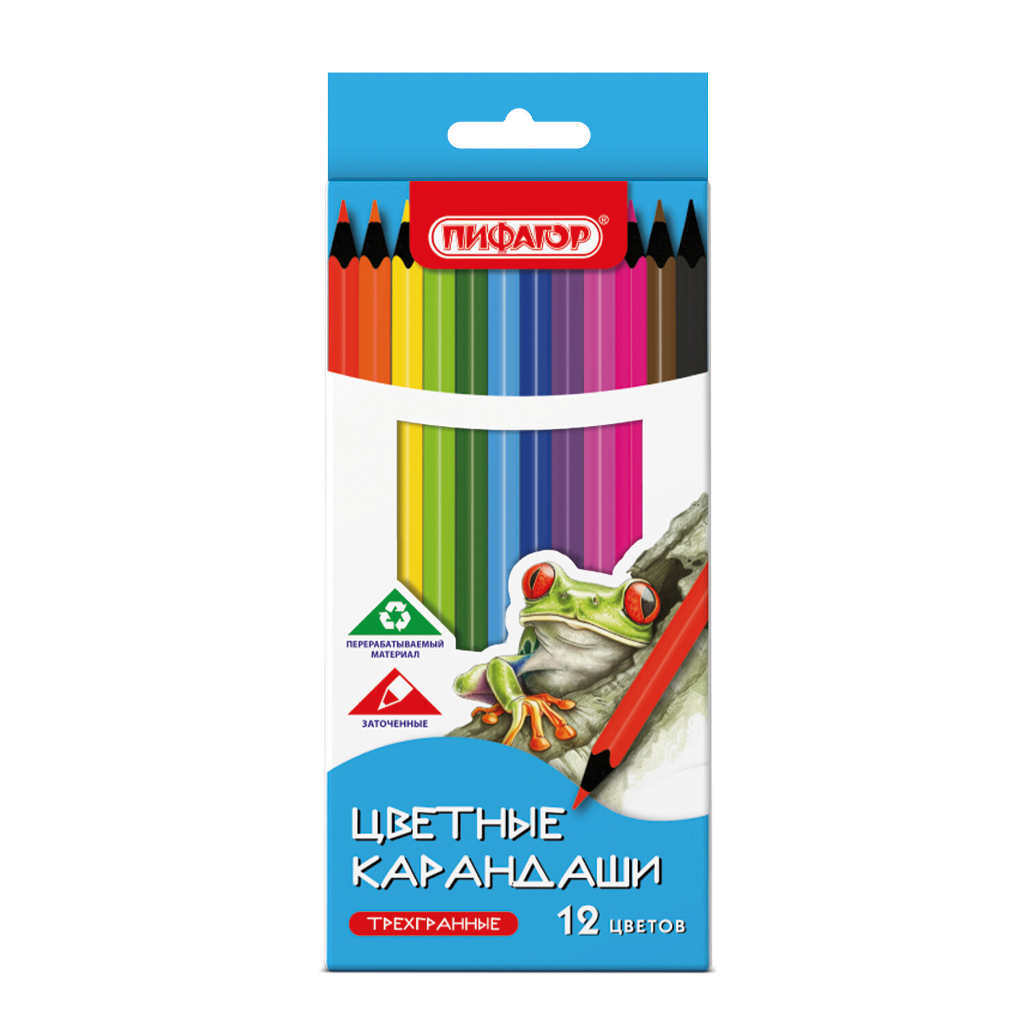 О товаре «Карандаши цветные ПИФАГОР СТАНДАРТ 12 цветов, трехгранный корпус, 182087»