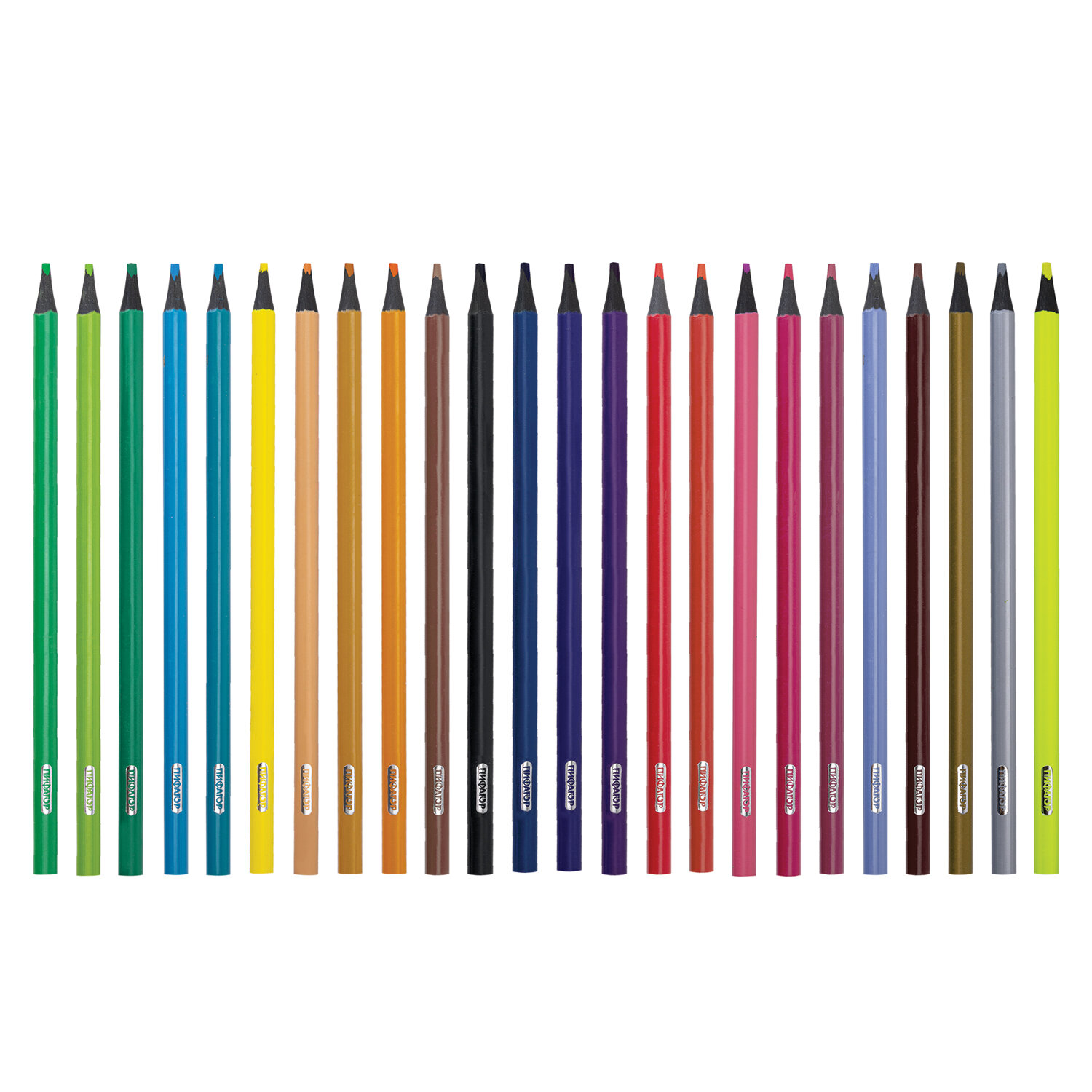 Набор состоит из 24 самых популярных цветов: красный, розовый, оранжевый, жёлтый, телесный, коричневый, зелёный, лимонный, голубой, синий, фиолетовый, чёрный, красно-оранжевый, пурпурный, тёмно-красный, флуоресцентный жёлтый, изумрудный, тёмно-синий, морковный, тёмно-коричневый, васильковый, ультрамарин, серый, белый. Трехгранная форма сечения корпуса удобна в использовании и позволяет карандашу не скатываться с поверхности стола во время занятий рисованием. Карандаши изготовлены из нетоксичного переработанного пластика. Корпус при разломе не образует острые края и безопасен для детей. Грифель легко затачивается и обладает повышенной прочностью. Все карандаши заточены и поставляются в картонной упаковке с европодвесом.