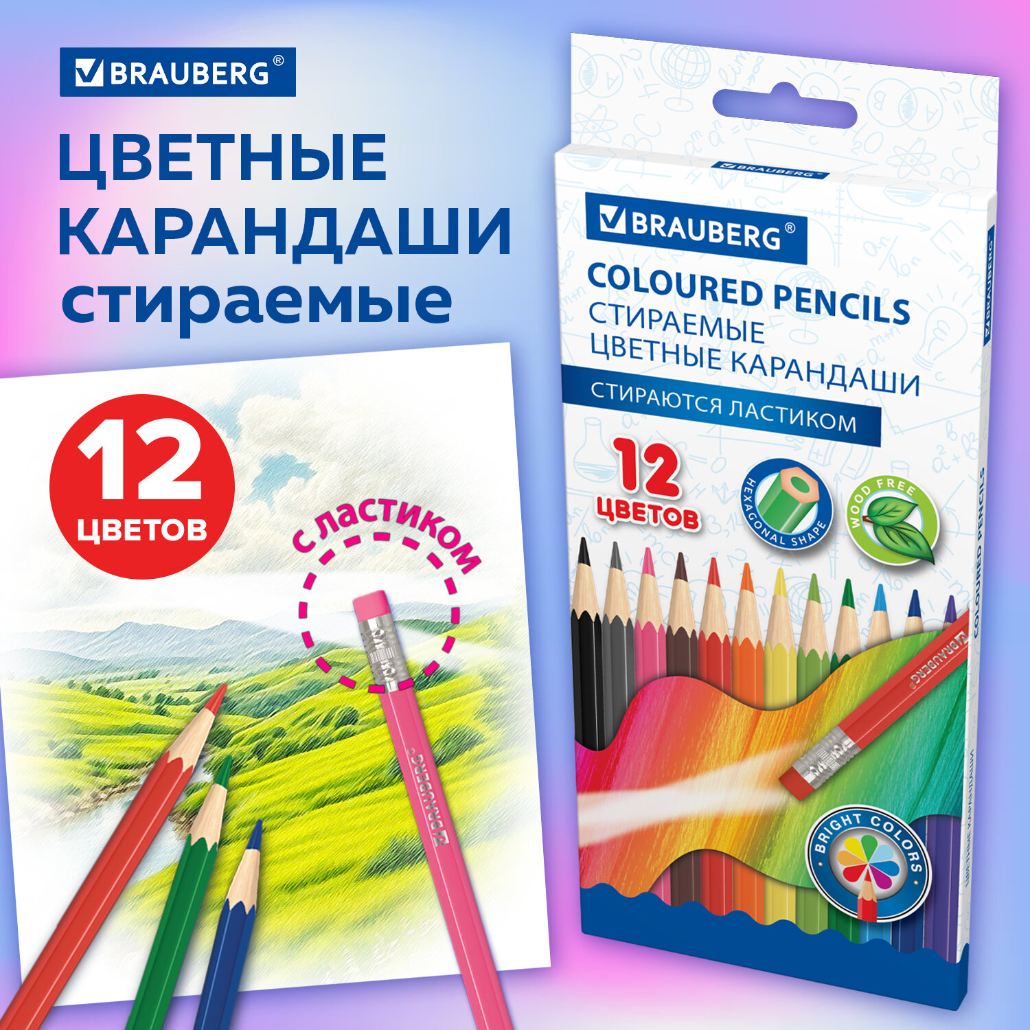 Карандаши цветные стираемые с ластиком BRAUBERG, 12 цветов, шестигранные, 182070