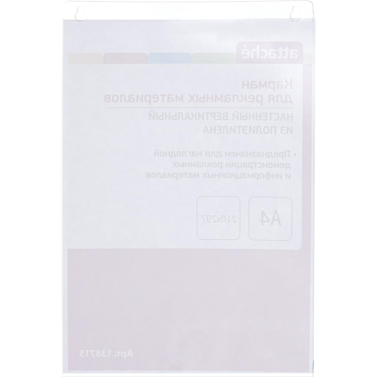 Карман вертикальный настенный Attache предназначен для размещения информации. Для изготовления использован прозрачный полиэтилен. Карман имеет одно отделение для размещения листов формата А4. На стене размещается в вертикальном положении. Запаян карман только снизу. Поставляется в защитной пленке. Крепежные отверстия высотой 12 мм — каплеобразные, диаметр нижней части — 8 мм. Толщина кармана — 0.7 мм. Поставляется упаковками по 10 штук.