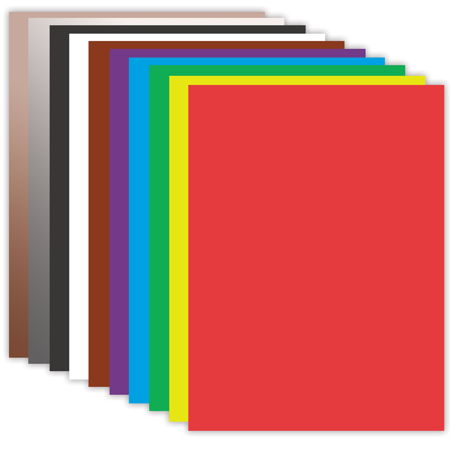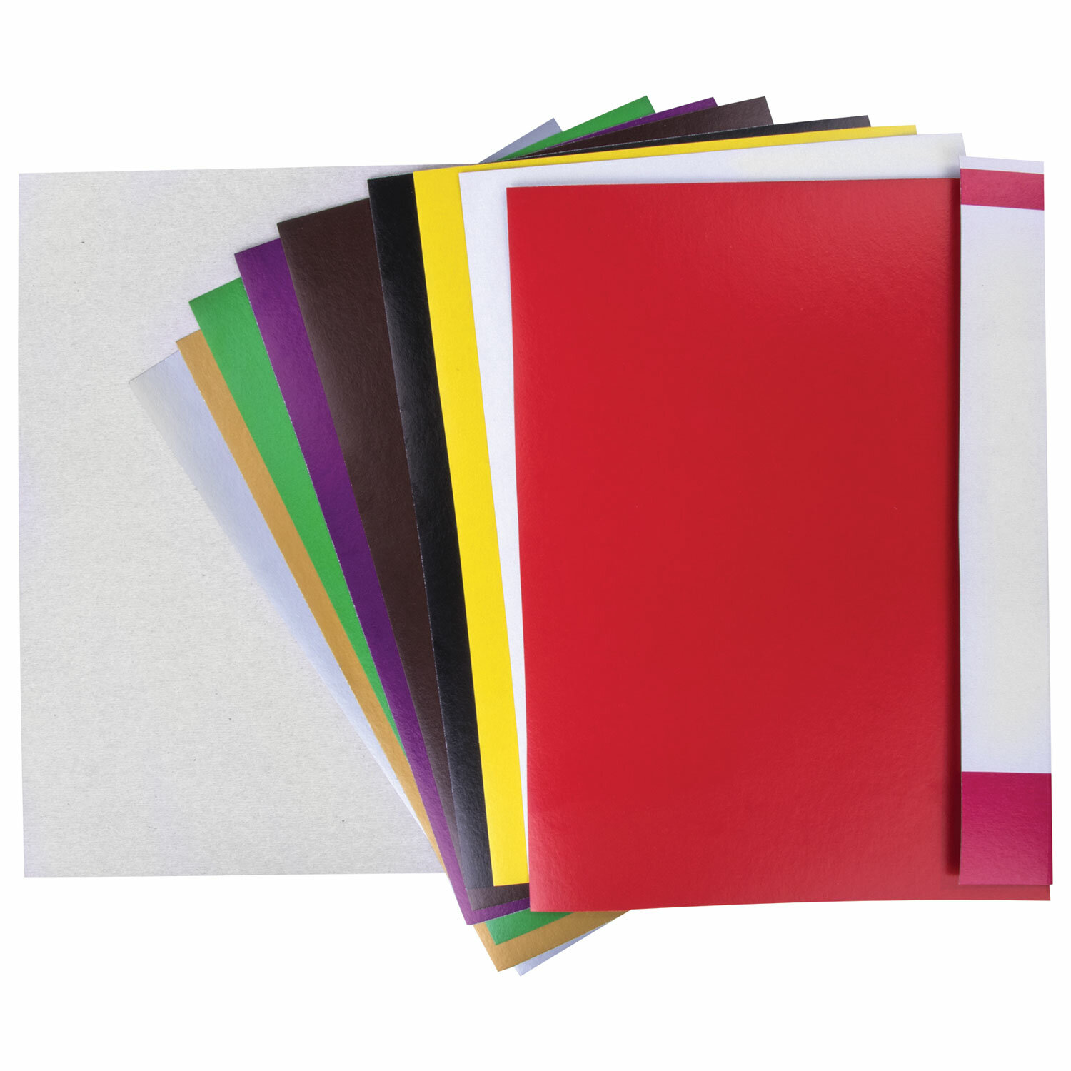 Мелованный картон с улучшенной прокраской обладает плотностью 200 г/м2. Легко режется ножницами, сгибается и клеится. Внутренний блок состоит из 10 листов формата А4 (200х290 мм) и 10 цветов: 8 основных + золото и серебро.
