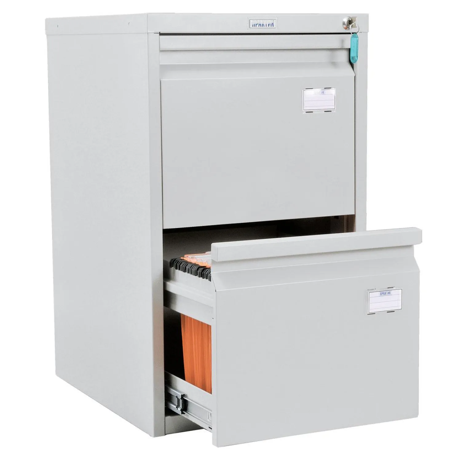 Шкаф картотечный предназначен для рационального и удобного хранения документов, предназначена для файловых подвесных папок формата А4. Ящики выдвигаются на всю глубину и имеют дно (возможность хранения любых офисных и личных вещей). Комплектуется ключевым замком (1000 комбинаций) с возможностью смены цилиндра. Тип материала — металл толщиной 0,8 мм. Количество ящиков — 2 штуки. Внутренние размеры ящика (ВхШхГ): 255×327×424 мм. Максимальная нагрузка на ящик — 20 кг. Формат — А4. Вместимость одной секции — 42 папок. Антиопрокидывающее устройство. Замок — 1 (центральный). Тип покрытия — порошковое, стойкое к появлению царапин.