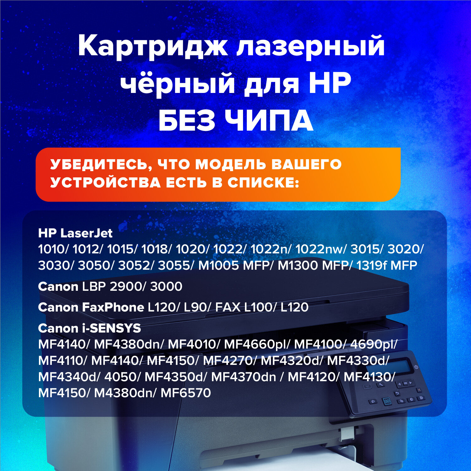 Совместимые лазерные картриджи SONNEN – это оригинальное качество по доступной цене. Данная модель не содержит ЧИП, подходит для лазерных принтеров и МФУ: HP LaserJet 1010/1012/1015/1018/1020/1022/1022n/1022nw/3015/3020/3030/3050/3052/3055/M1005 MFP/M1300 MFP/1319f MFP; Canon LBP 2900/3000; FaxPhone L120/L90/ FAX L100/L120; i-SENSYS