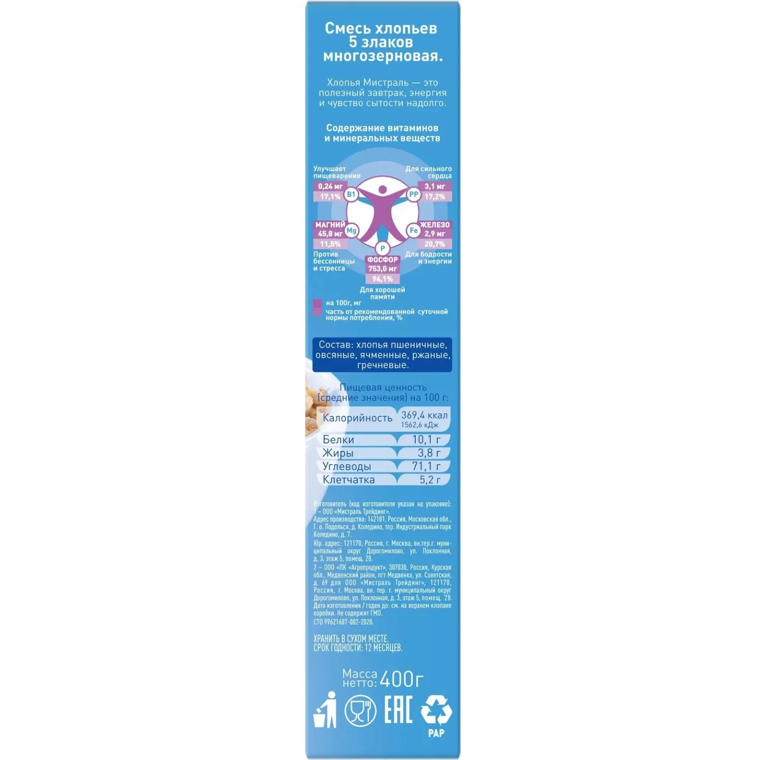 Хлопья Мистраль — это полезный завтрак, энергия и чувство сытости надолго. Полезные сложные углеводы и ценная клетчатка способствуют улучшению пищеварения. Витамины и микроэлементы заряжают бодростью и хорошим настроением на целый день. Мы используем уникальную технологию BIO STEAM, понимая, как мало времени с утра для приготовления быстрого и вкусного завтрака с пользой для всей семьи.