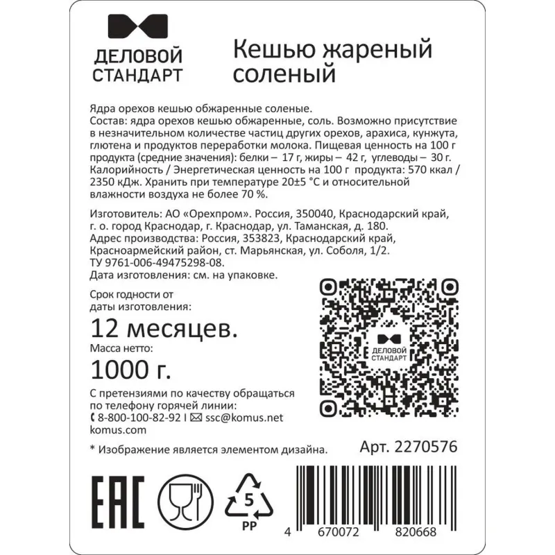 О товаре «Кешью Деловой Стандарт жареный соленый, 1кг»