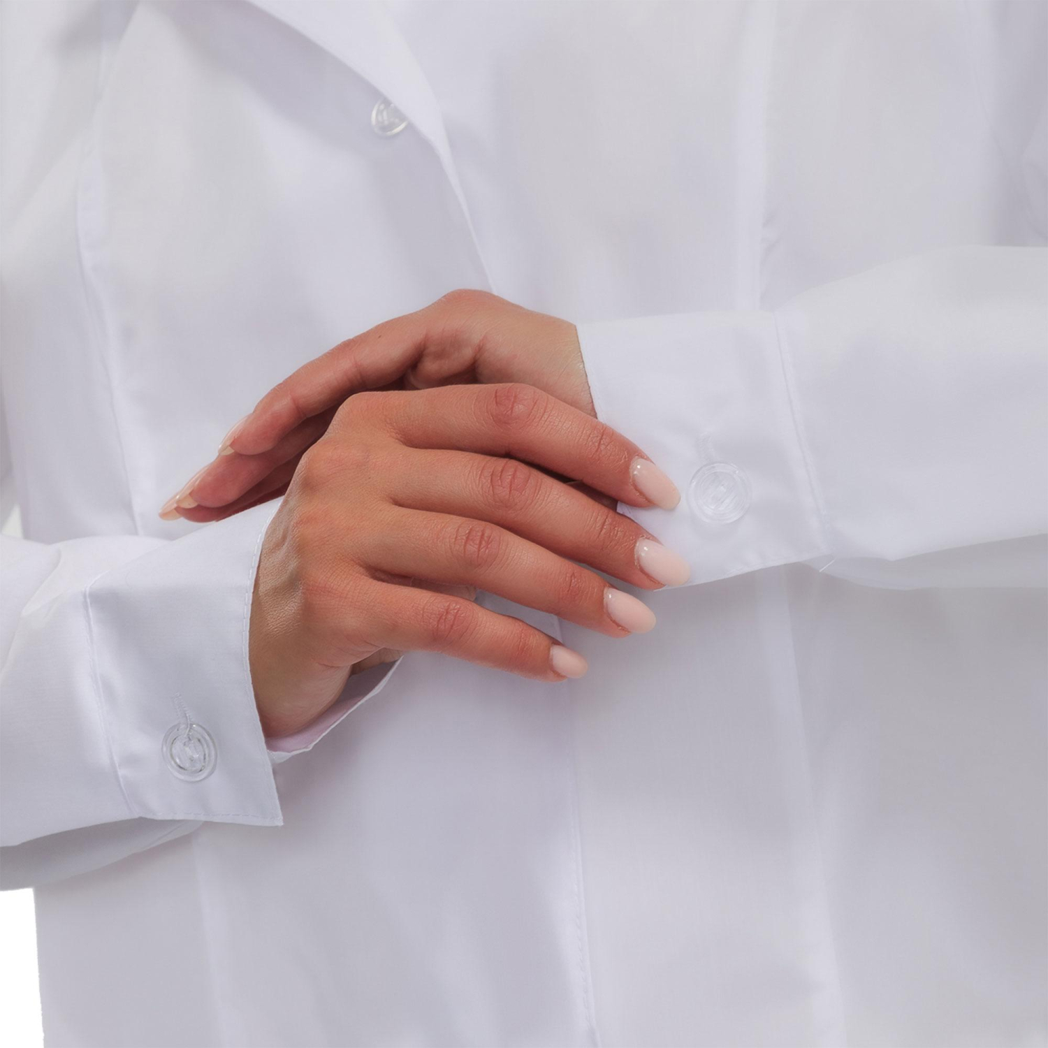 Модель прямого кроя со свободным силуэтом, что обеспечивает комфорт при движении. Халат застёгивается на пуговицы по центральному шву. Длинные рукава с прямыми манжетами дополнены отложным воротником классического кроя. Для удобства использования предусмотрены два вместительных боковых накладных кармана.