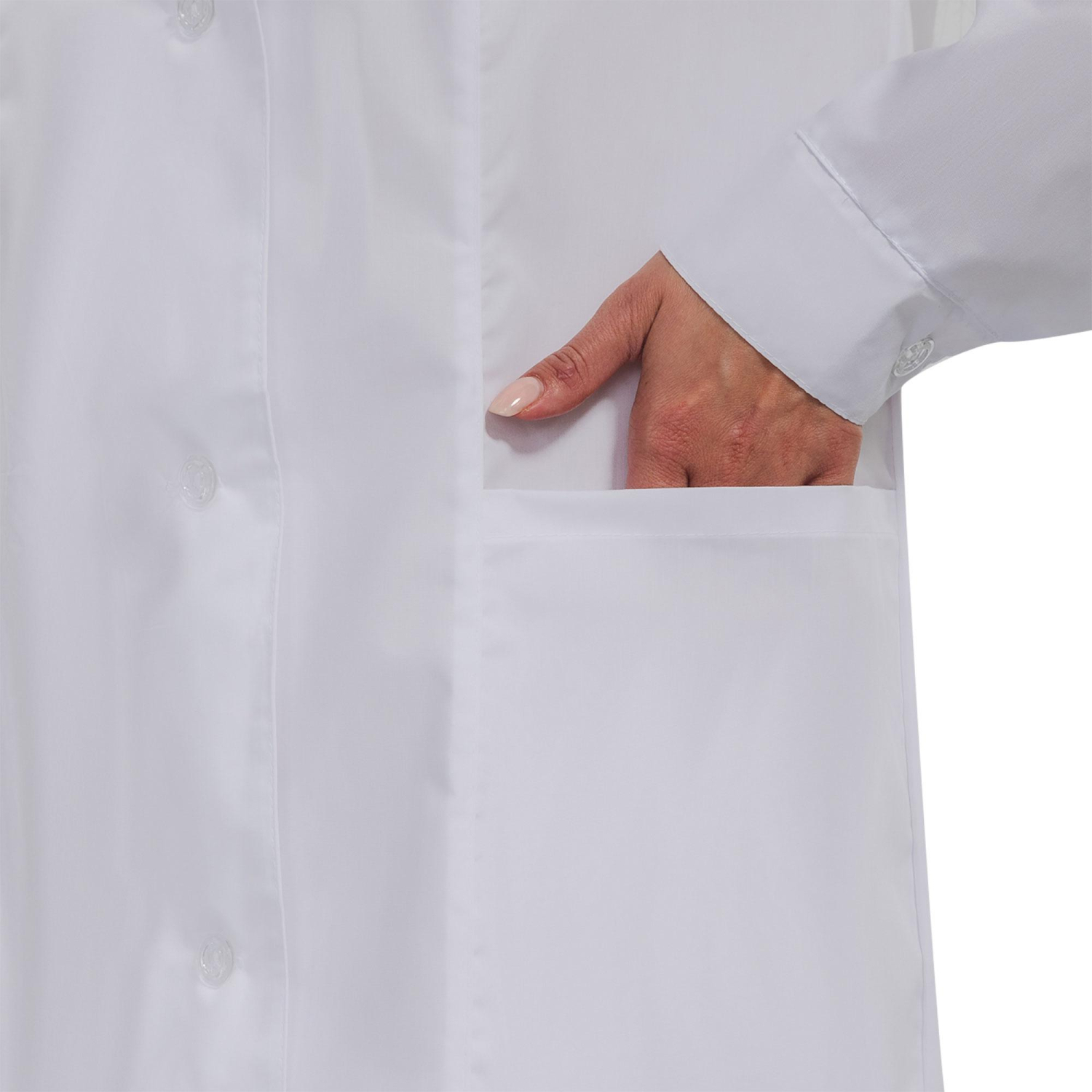 Модель прямого кроя со свободным силуэтом, что обеспечивает комфорт при движении. Халат застёгивается на пуговицы по центральному шву. Длинные рукава с прямыми манжетами дополнены отложным воротником классического кроя. Для удобства использования предусмотрены два вместительных боковых накладных кармана.