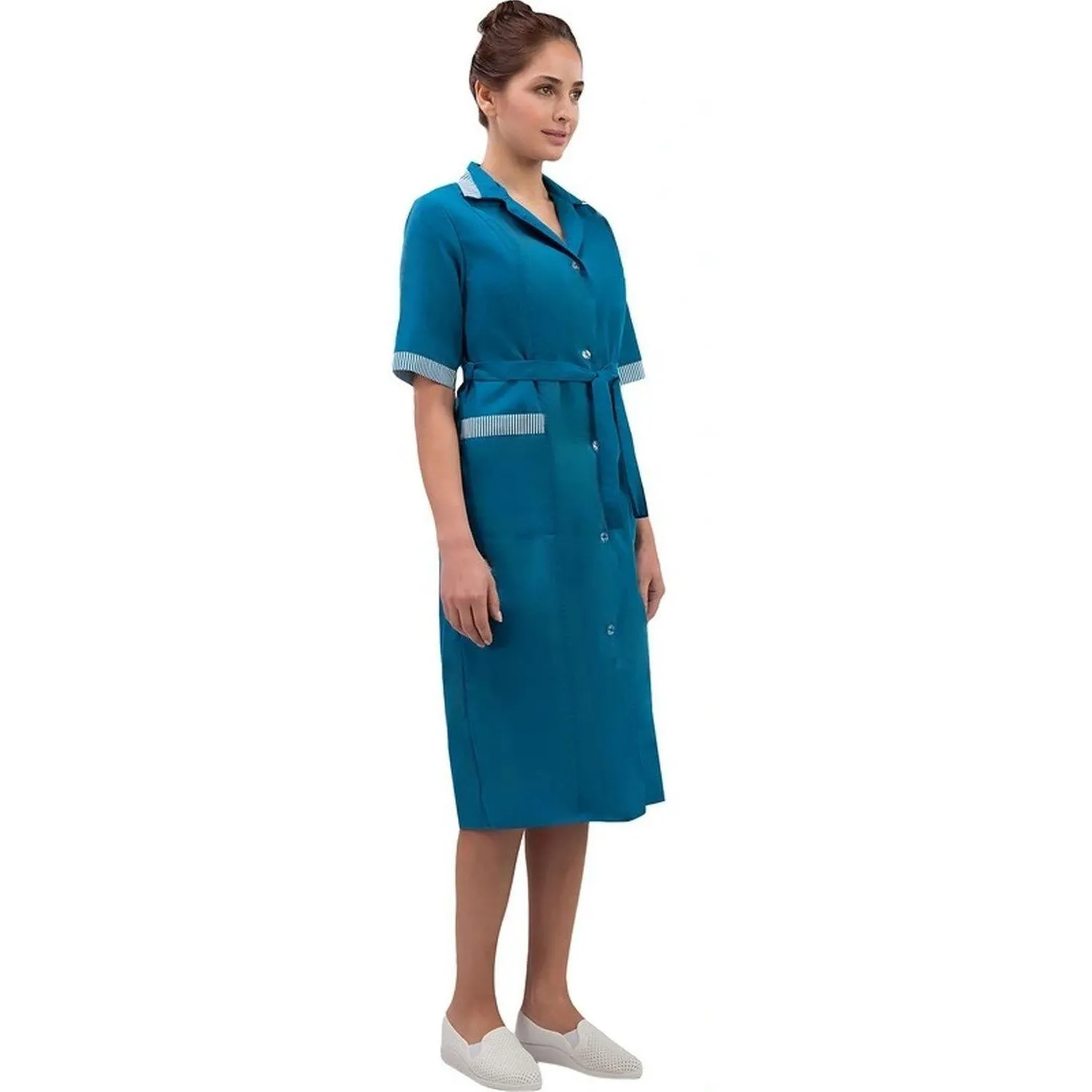 Женский халат для горничных и уборщиц у01-ХЛ размер 96-100 (48-50), рост 158-164 см. Изготовлен из смесовой ткани Ти-Си, цвет бирюзовый (сине-зеленый), состав — 65% полиэфира и 35% хлопка (плотность ткани 120 г/кв.м.). Ти-Си — материал, приятный на ощупь, гигиеничен и долговечен. Не мнется, легко и быстро стирается, быстро сохнет. Долго сохраняет свой первоначальный яркий цвет. Ткань «дышит», благодаря входящему в состав хлопку, имеет повышенный срок службы и проста в уходе, благодаря полиэфиру. Рукав короткий. Воротник отложной с лацканами, есть накладные карманы. Отлет воротника, верхние части карманов и края рукавов отделаны светлой тканью. Халат застегивается на пуговицы. Униформа рекомендована для сферы обслуживания, клининга, гостиничного бизнеса.
