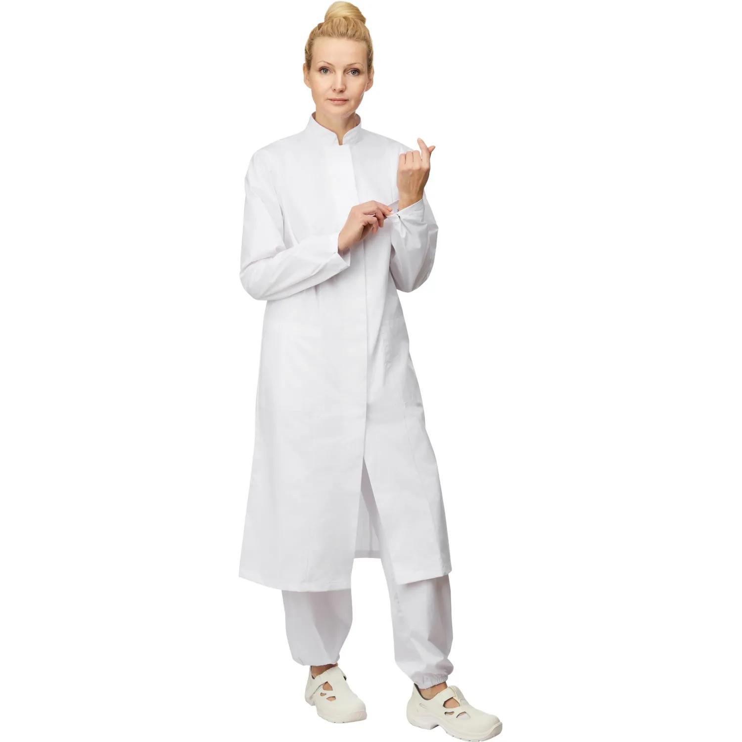Женский рабочий халат у17-ХЛ САТ ХАССП белого цвета предназначен для защиты от общих производственных загрязнений. Подходит для использования на пищевых производствах, в учреждениях общепита, лабораториях и других зонах с повышенными санитарными требованиями.