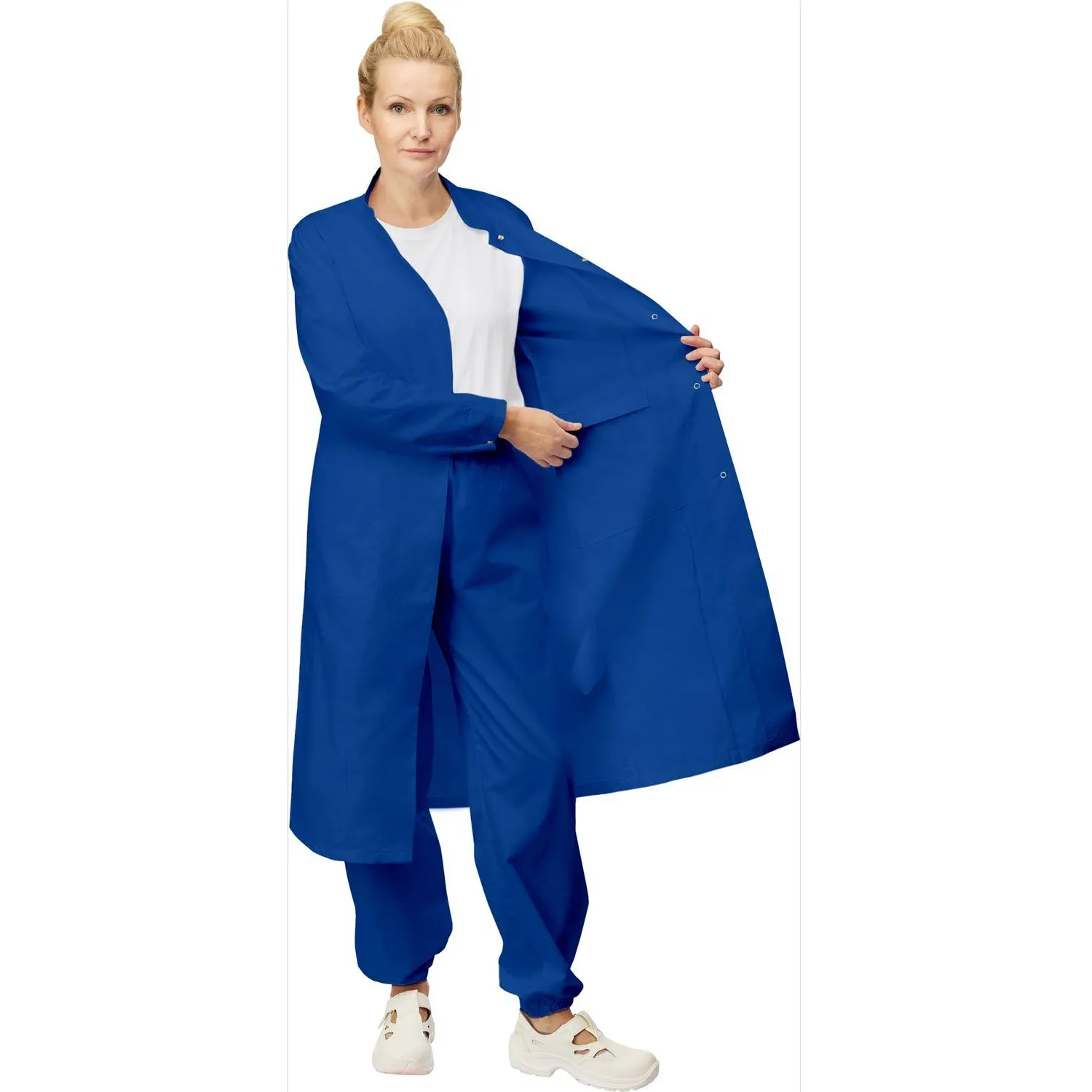 Женский рабочий халат у17-ХЛ САТ ХАССП василькового цвета предназначен для защиты от общих производственных загрязнений. Подходит для использования на пищевых производствах, в учреждениях общепита, лабораториях и других зонах с повышенными санитарными требованиями.