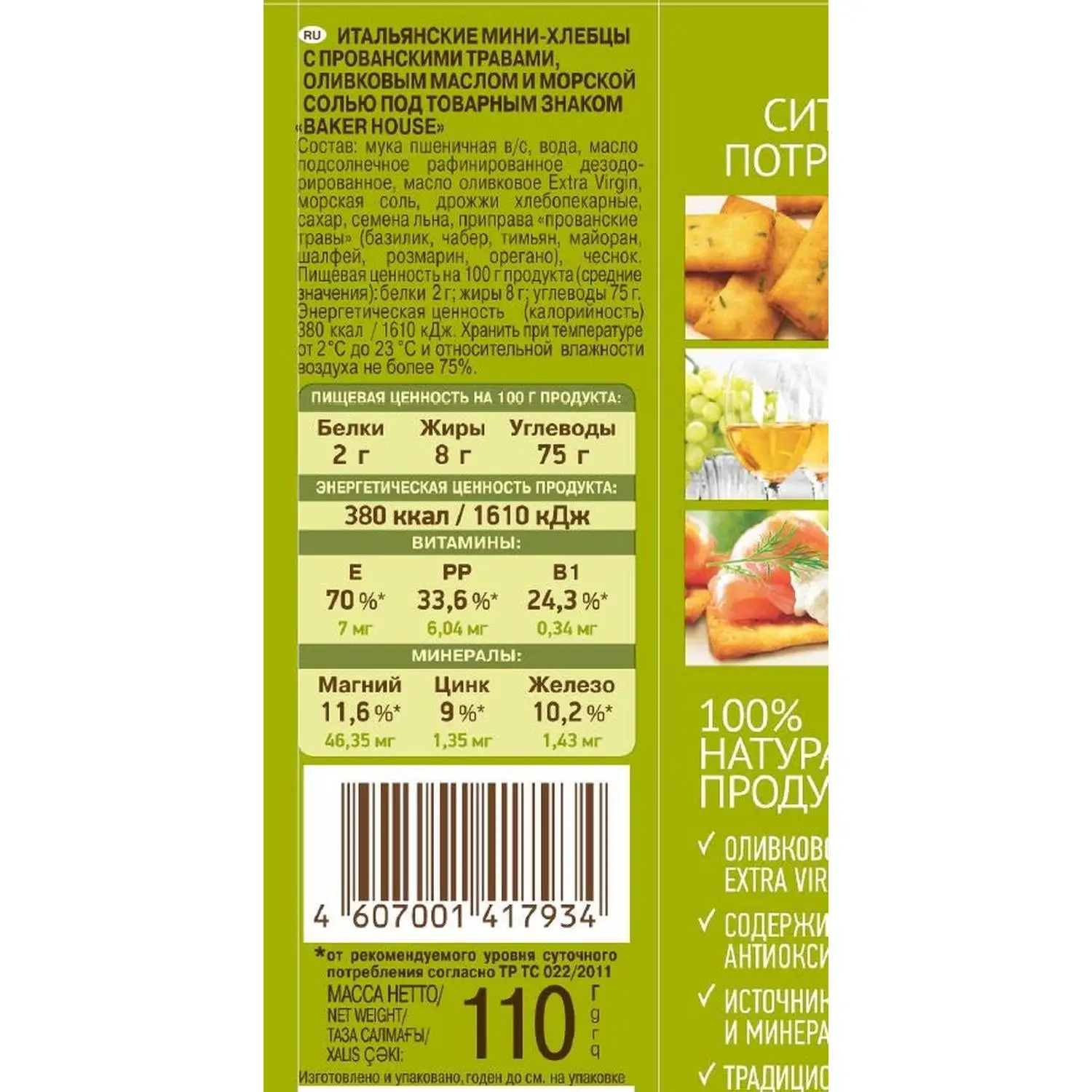 Итальянские хлебцы, под торговой маркой «Baker House», приготовленные по оригинальному рецепту, с витаминами и полезными минералами, имеют в составе 100% натуральные ингредиенты, в т.ч. оливковое масло Extra Virgin.