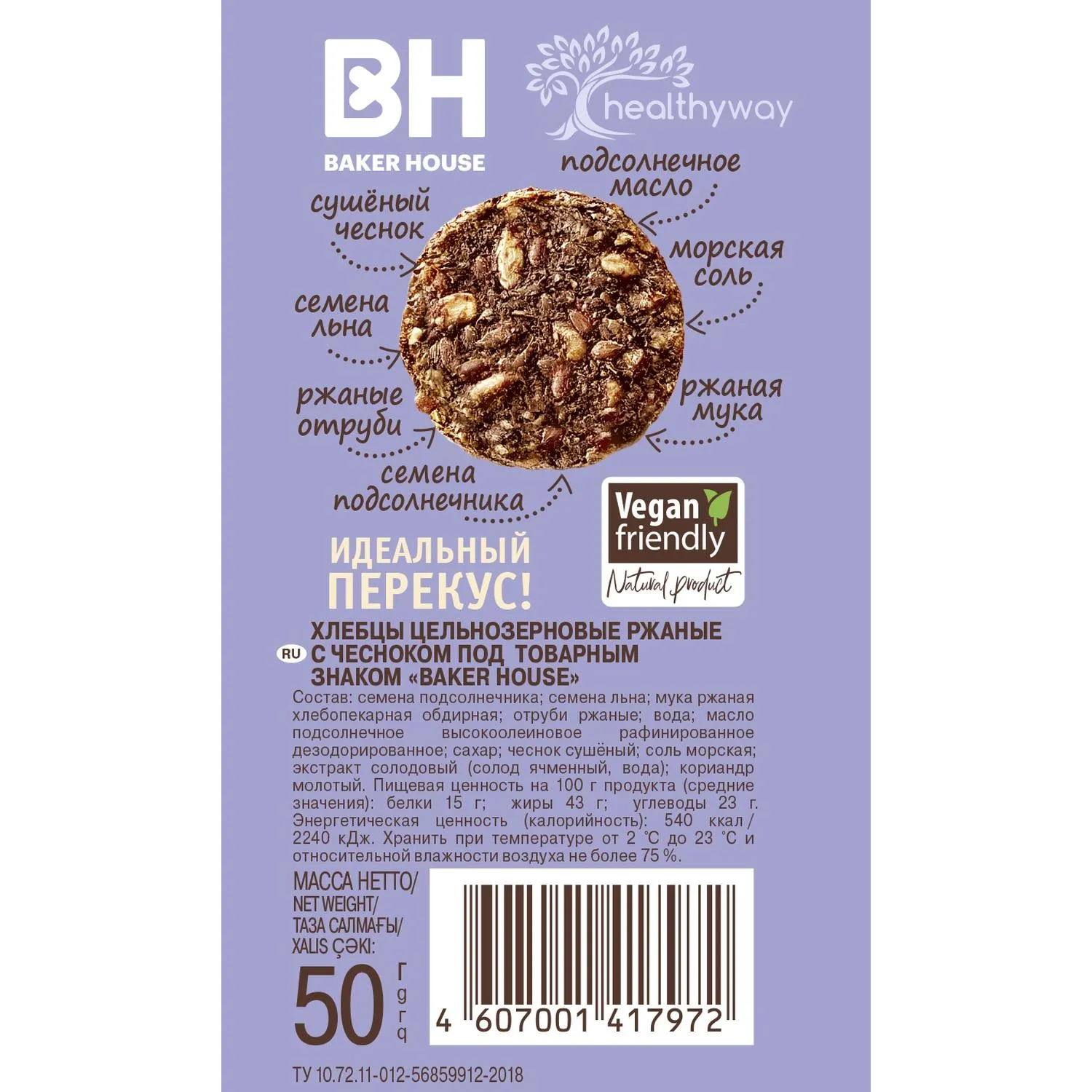 О товаре «Хлебцы цельнозерновые Baker House ржаные с чесноком, 50г»