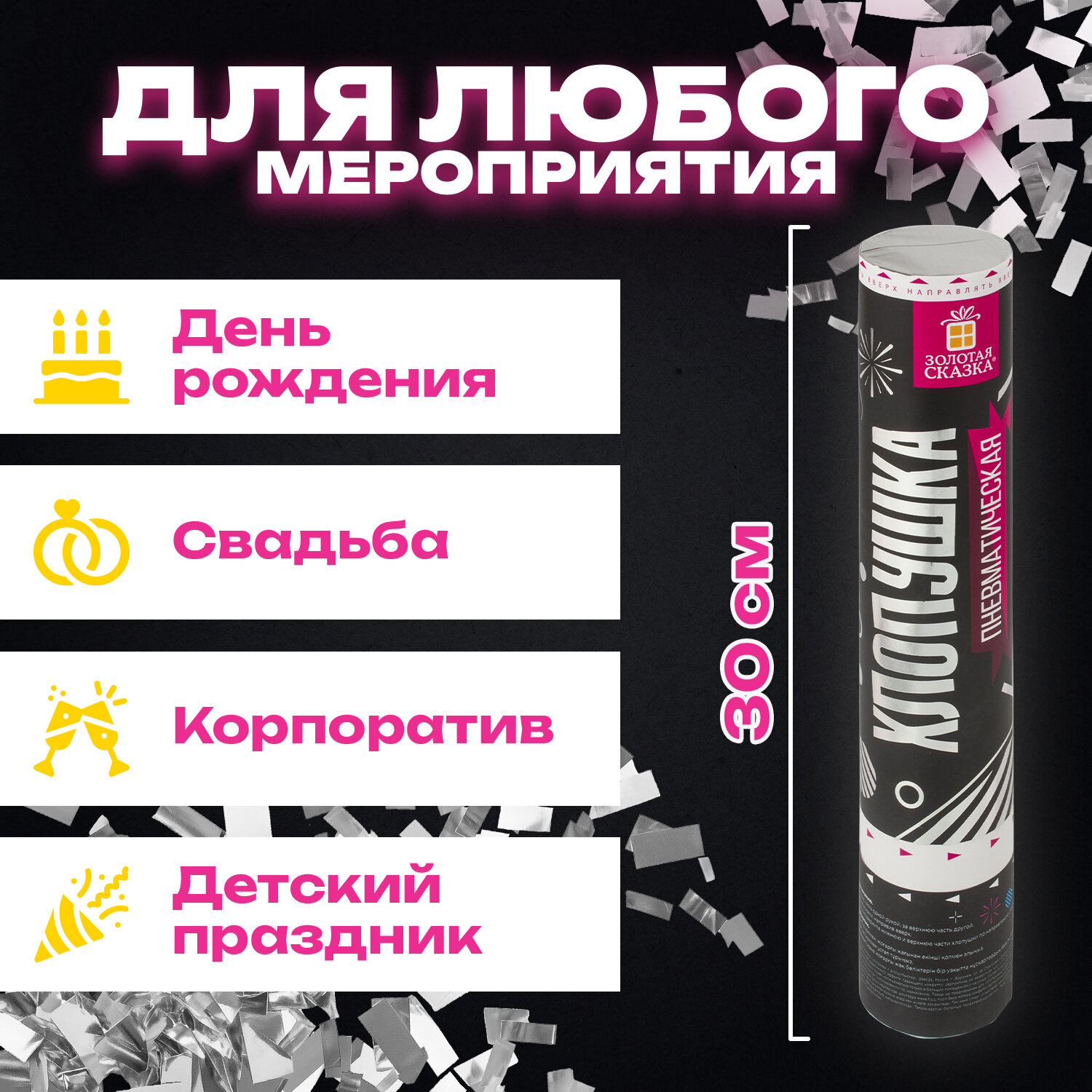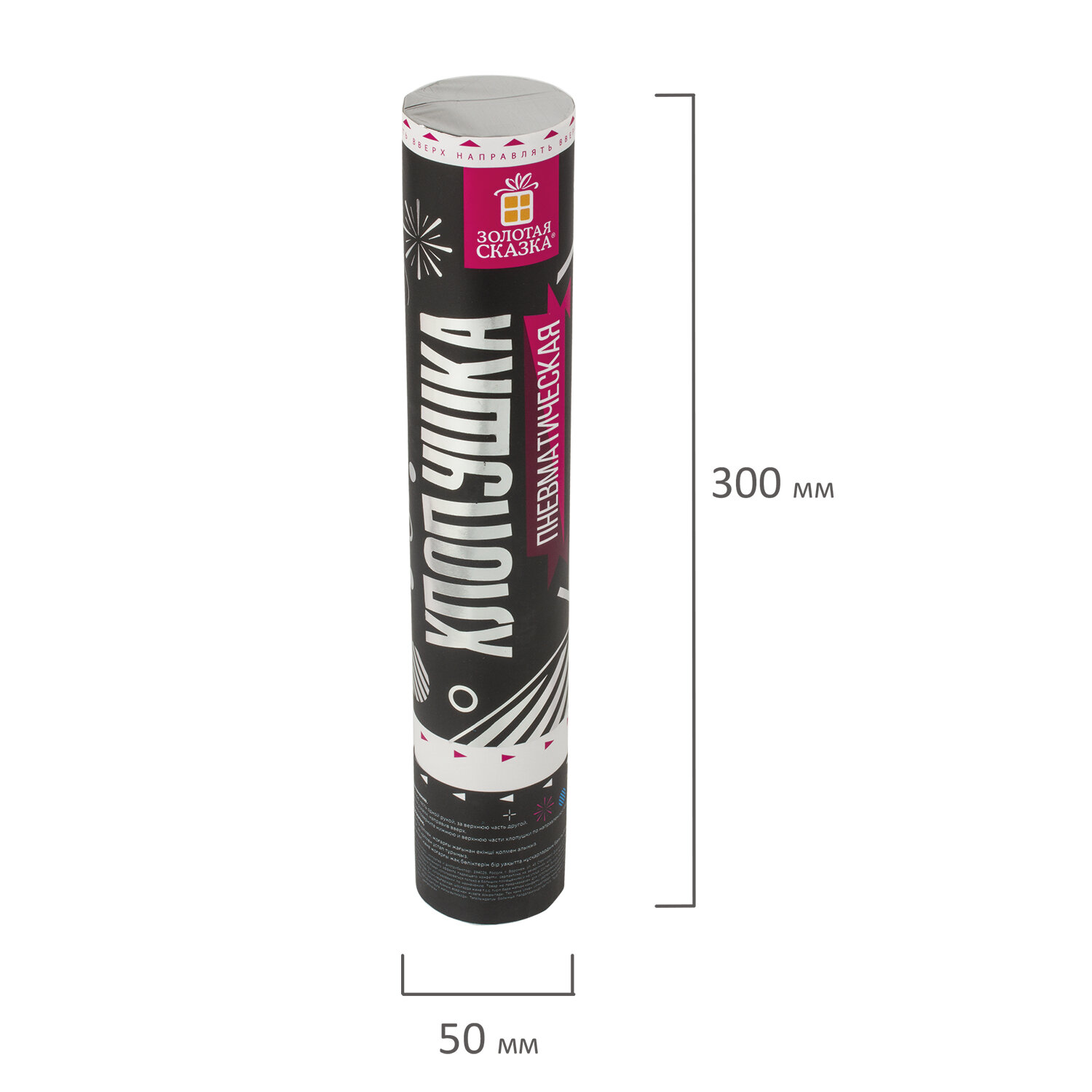 Хлопушка высотой 30 см с фольгированным наполнителем в виде прямоугольников серебристого цвета является абсолютно безопасной. Выстрел осуществляется под действием сжатого воздуха. Не является пиротехникой. Средняя дальность выстрела – 5-7 м. Корпус хлопушки состоит из двух частей: пневматического баллона со сжатым воздухом и картонного цилиндра с наполнителем. Рекомендуется использовать хлопушку внутри больших помещений или на улице.