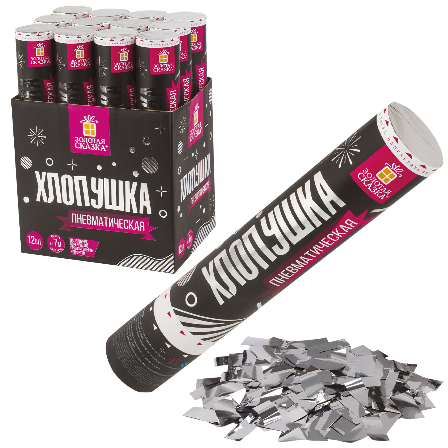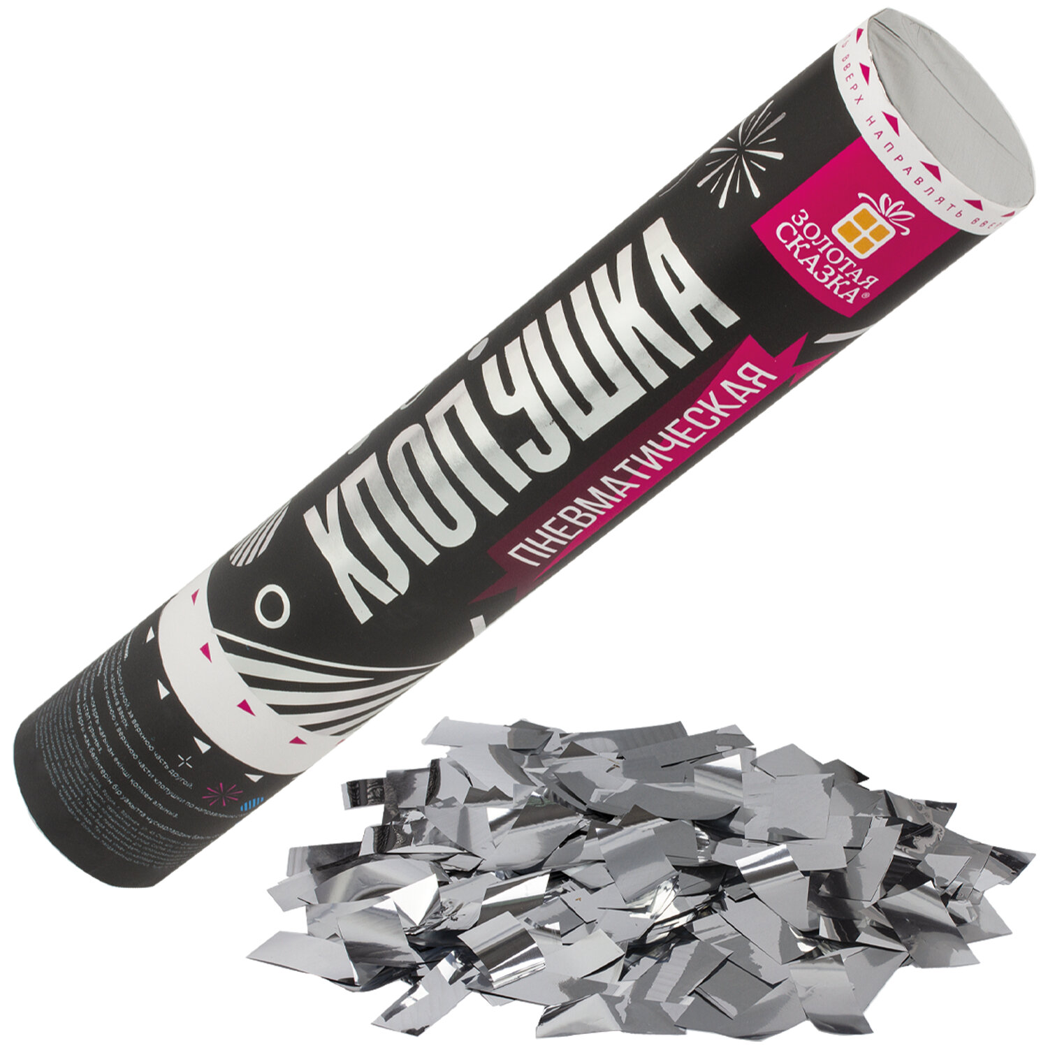 О товаре «Хлопушка пневматическая ЗОЛОТАЯ СКАЗКА 30 см, фольга, прямоугольники, серебристый, 591477»