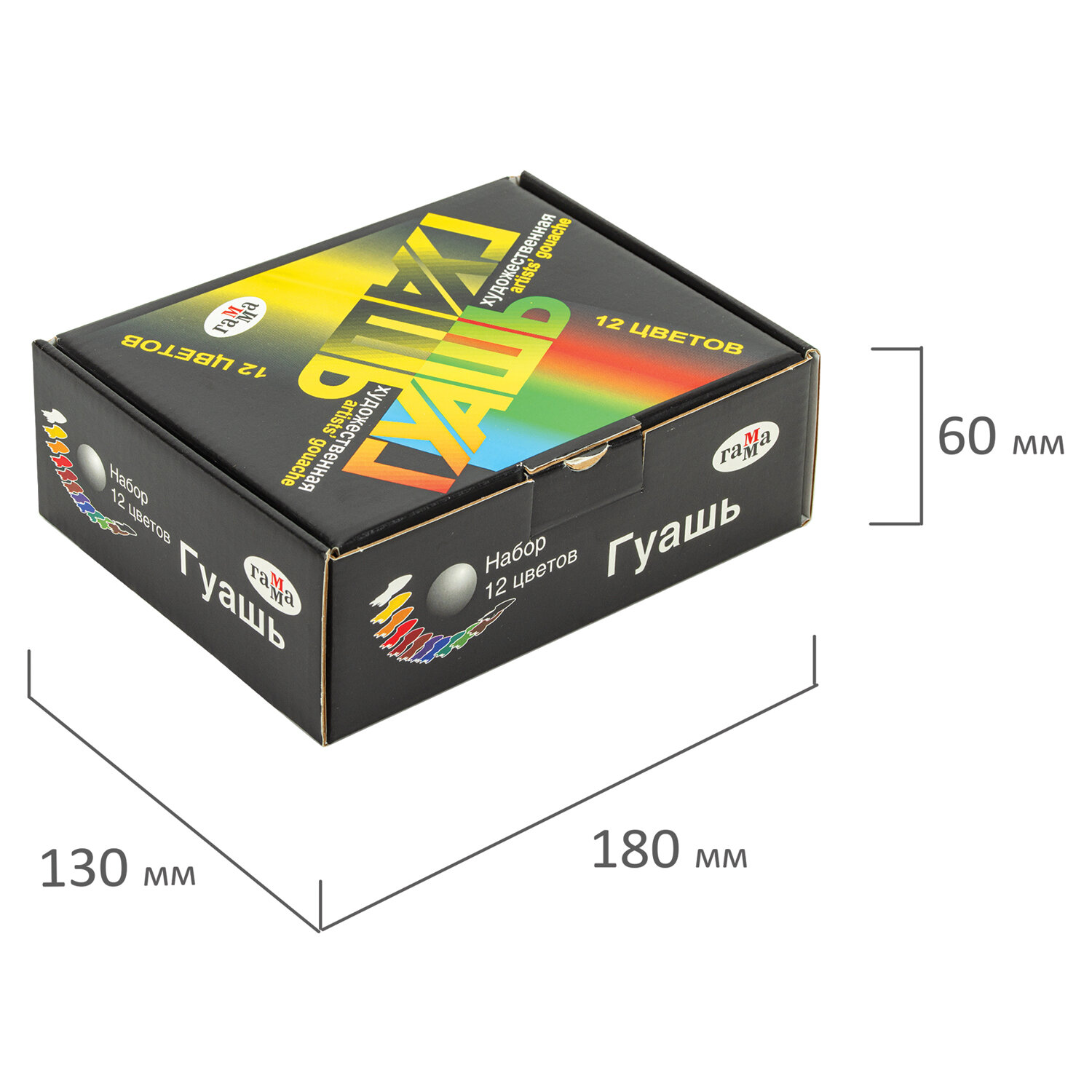 Набор составлен из 12 цветов гуаши: белая титановая, желтая светлая, алая, зеленая, синяя спектральная, черная, охра золотистая, изумрудно-зеленая светлая, фиолетовая темная, красная, железо-окисная, марс коричневый темный, краплак красный.