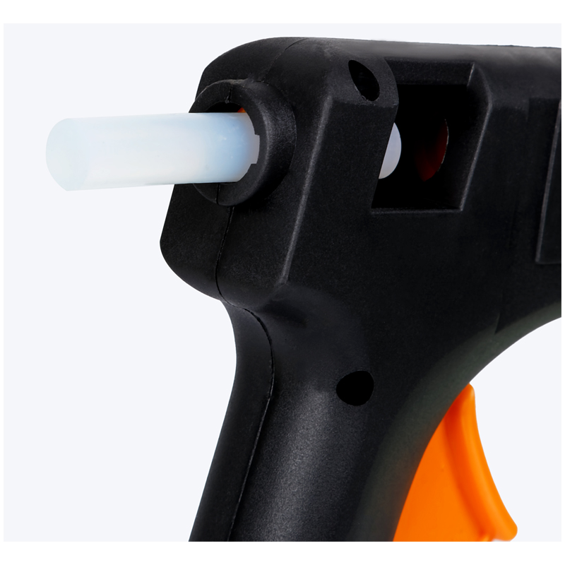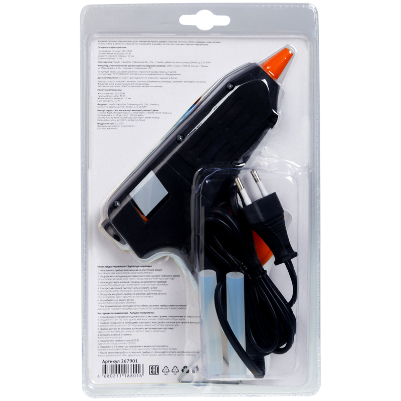 Пистолет клеевой 40 Вт большой (в блистере) предназначен для прочной фиксации поверхностей с помощью расплавленной клеевой массы. Заправляется он специальным клеевым стержнем диаметром 11 мм. Корпус клеевого пистолета изготовлен из ударопрочной пластмассы и имеет скобу для надежной установки в нерабочем положении. Принцип работы: клеевый стержень плавится в металлической камере с помощью нагревательного устройства и для точного дозирования при нажатии на курок подаётся из сопла на склеиваемую поверхность. Мощность пистолета в 40 Вт позволяет очень быстро разогреть клеевой стержень и получать удовольствие от быстрой и бесперебойной работы. С его помощью вы сможете склеить: дерево, пластик, резину, кожу, стекло, металлы (их лучше перед работой разогревать феном), ткань, пенопласт, керамику, картон, бумагу, цветы или что-то другое. Используется как в домашних условиях, так и на производстве: для монтажа электрических плат, декорирования, изготовления упаковочной и сувенирной продукции, при прокладке кабеля сетей фиксированной телефонной связи и сетей передачи данных, при производстве багетов и картинных рам. Клеевой стержень в комплекте. Два клеевых стержня в комплекте.