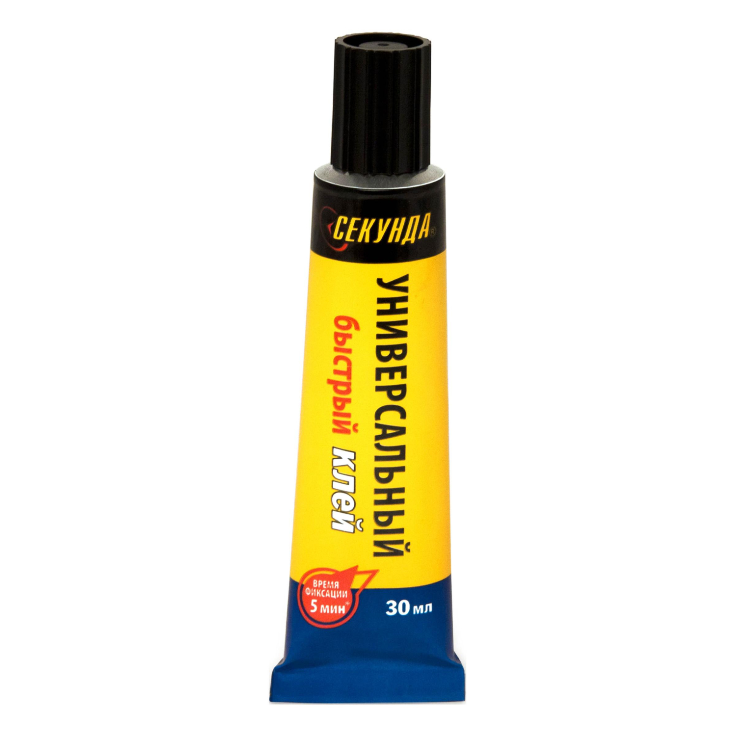 Универсальный быстрый клей «Секунда» состоит из полиуретана, ацетона, этилоксалата и других компонентов. Прозрачный. Применяется для соединения в различных сочетаниях дерева, металла, мягкого и жесткого ПВХ, полистирола, оргстекла, резины, войлока, кожи, фарфора, керамики, стекла. Удлиненный носик облегчает процесс нанесения клея. Водостойкость и высокие прочностные показатели позволяют использовать его для скрепления изделий, эксплуатирующихся под нагрузкой и в условиях высокой влажности. Склеивает пористые материалы. Тюбик содержит 30 мл универсального клея.